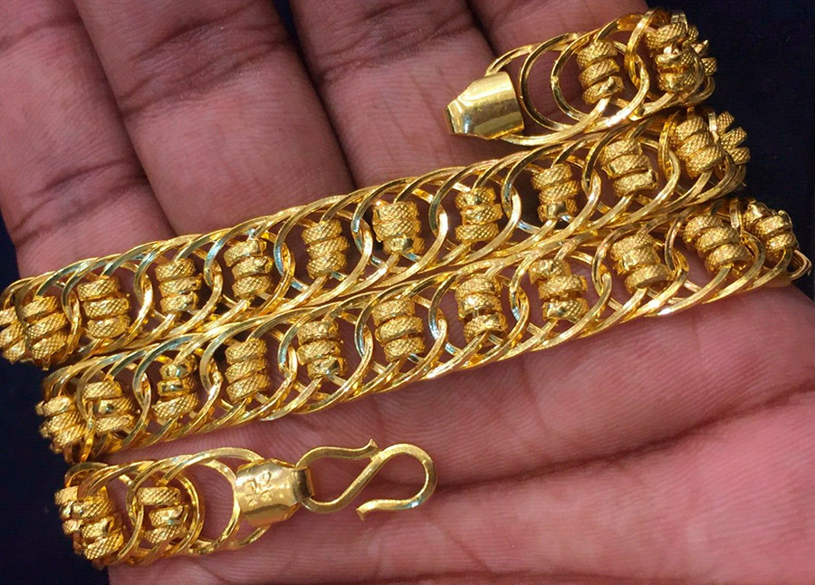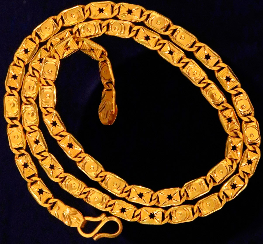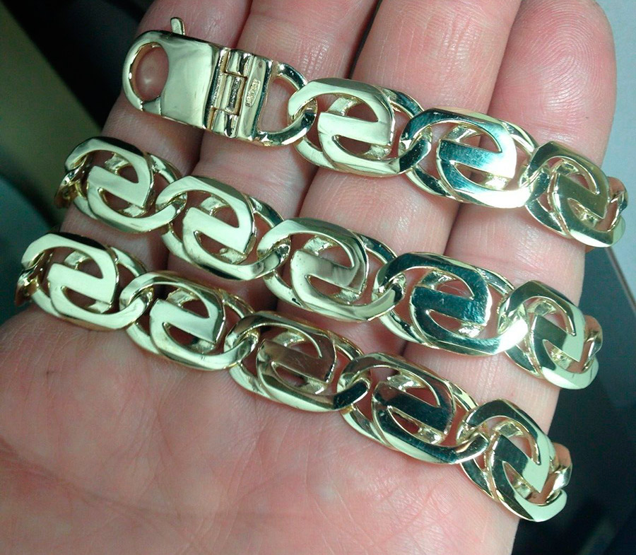 Moins chères, mais apparemment volumineuses et imposantes, sont les chaînes en or "creuses". Mais c'est aussi leur inconvénient, car si le lien est mal plié, une rupture peut se produire. Malheureusement, il sera très difficile de restaurer une telle chaîne.