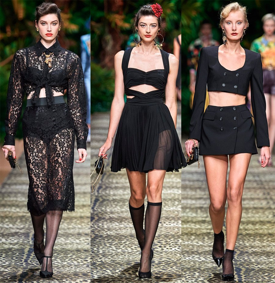 5. Style Dolce & Gabbana. Vers le milieu du spectacle, les créateurs ont sorti des modèles dans les robes noires et les ensembles noirs emblématiques de la marque, qui dans certains cas peuvent être appelés costumes, quelque part dans des robes séparées. Ils sont tous parfaits pour créer des looks séduisants. La nouvelle collection comprend également le célèbre style de lingerie, ainsi que des tenues pour les fêtes d'été dans divers endroits.