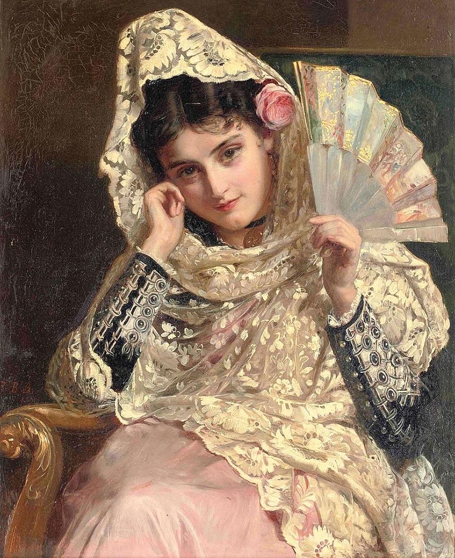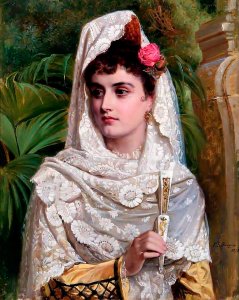 Parmi tous les grands artistes, je voudrais citer l'artiste anglais John Bagnold Burgess (1829-1897), pour qui l'Espagne est devenue le thème principal de son œuvre. Ayant visité l'Espagne pour la première fois en 1858, il y revient constamment, visitant chaque année pendant 30 ans.Il a consacré sa vie à étudier le pays, son mode de vie et son caractère national, incarnant des thèmes espagnols et tziganes sur ses toiles. Dans ces peintures, on peut souvent voir des femmes à haute crête, portant une mantille de dentelle noire qui met en valeur le marbre du corps.