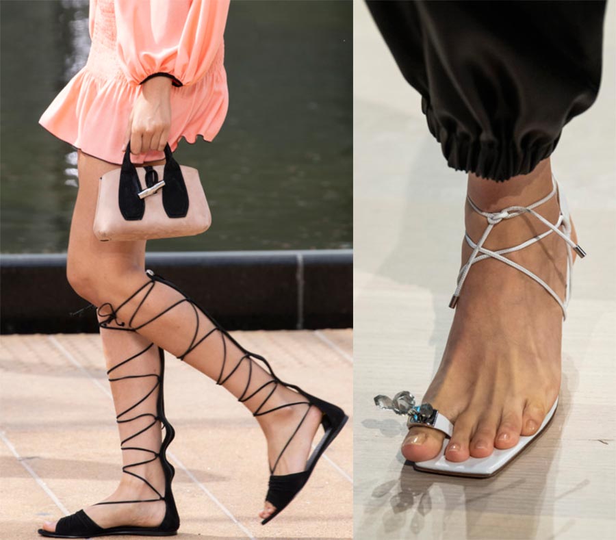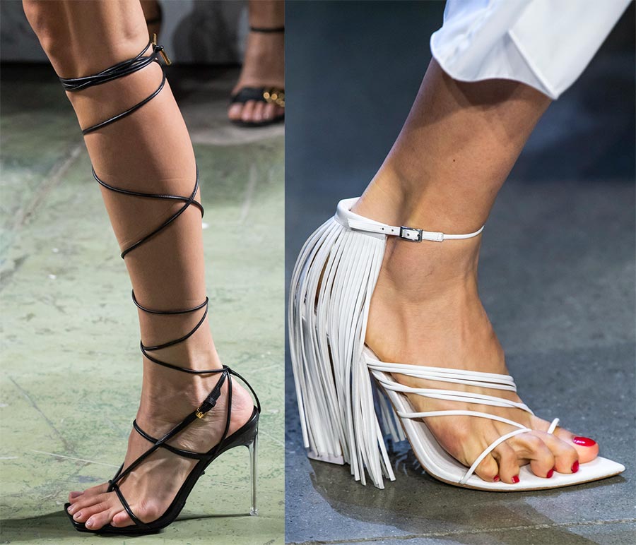 La tendance de l'année dernière pour les sandales à lanières fines se transforme cette année en une tendance pour les cravates longues et les lacets, et nous porterons non seulement des cravates fines, comme Versace, mais aussi des lacets plus massifs, comme Sportmax, et Prabal Gurung nous propose cette saison des lacets. sous la forme d'une frange.