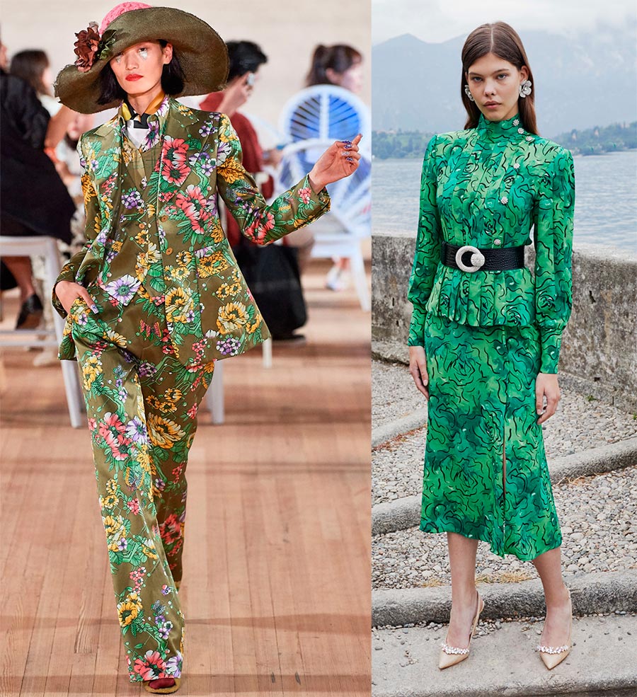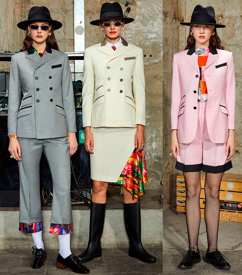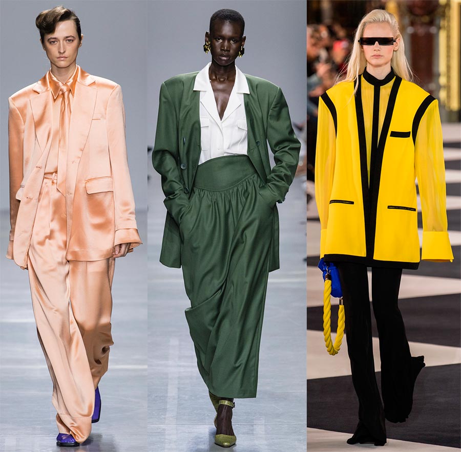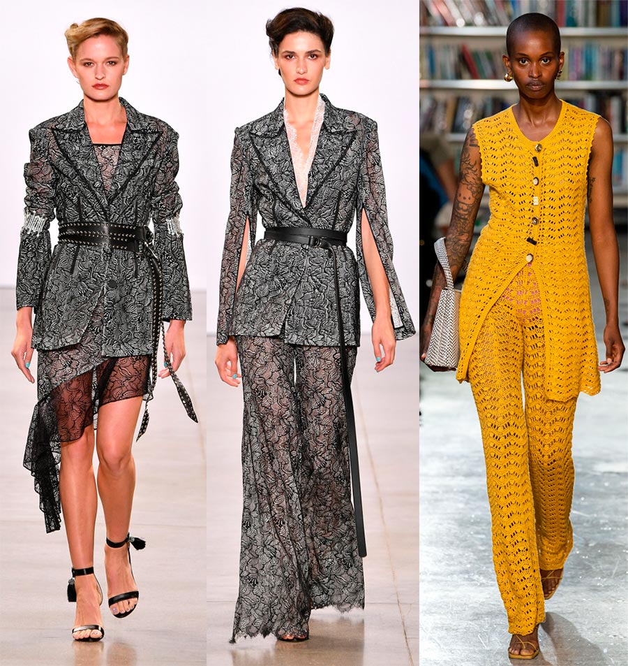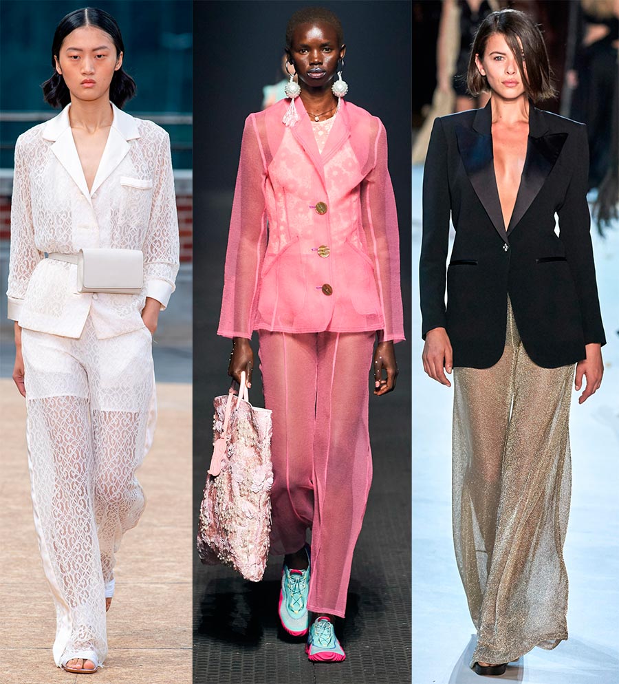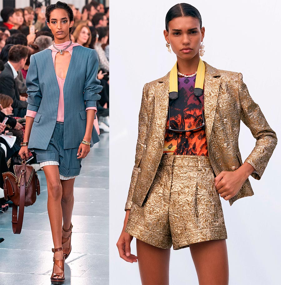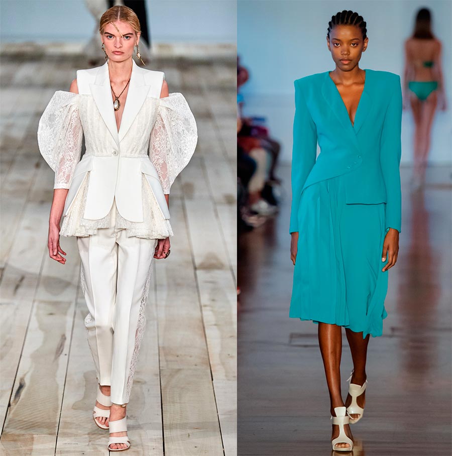 Par exemple, Alessandra Rich propose un costume avec une minijupe et un haut court, Alexander McQueen propose une coupe sophistiquée encadrée de dentelle, Fatima Lopes propose un costume turquoise vif avec une élégante asymétrie.