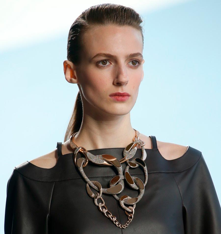 Collier en métal couléLes colliers en fonte, similaires aux bijoux égyptiens antiques ou antiques, seront également à la mode. Ils ne sont pas reliés par des liens, mais représentent une seule plaque. Il est conseillé de choisir de tels colliers de petit diamètre, comme les colliers ras de cou. Les colliers en métal coulé séduiront les amateurs de laconicisme et de minimalisme, et ceux qui veulent choquer le public et être originaux.Nous avons vu des options sous la forme de colliers ou de plaques métalliques massives sur le cou chez Elie Saab, Phillip Lim, Christopher Kane, Gucci, Valentino, Alberta Ferretti.