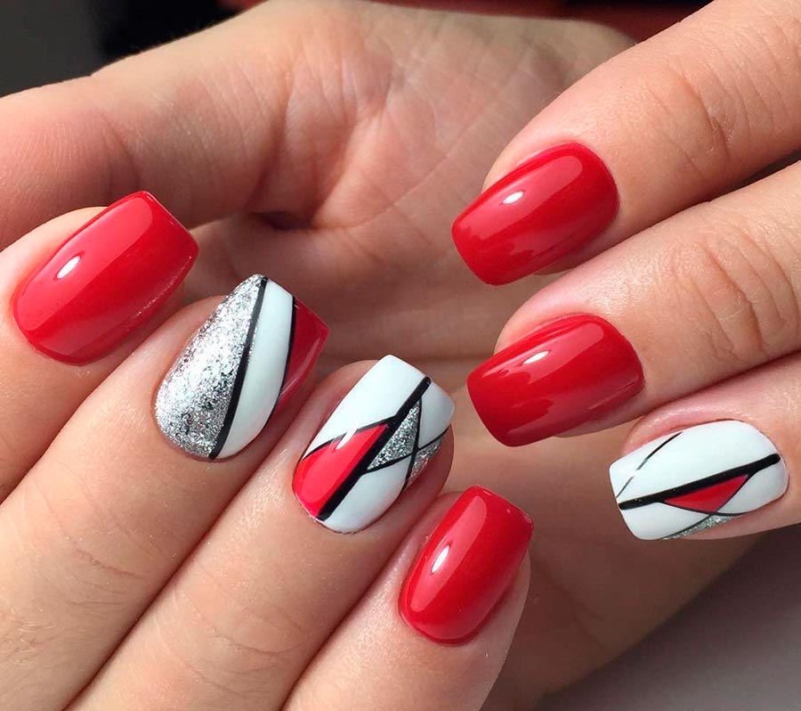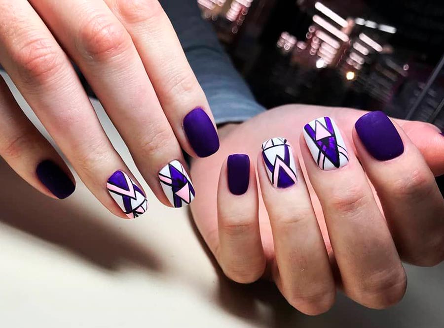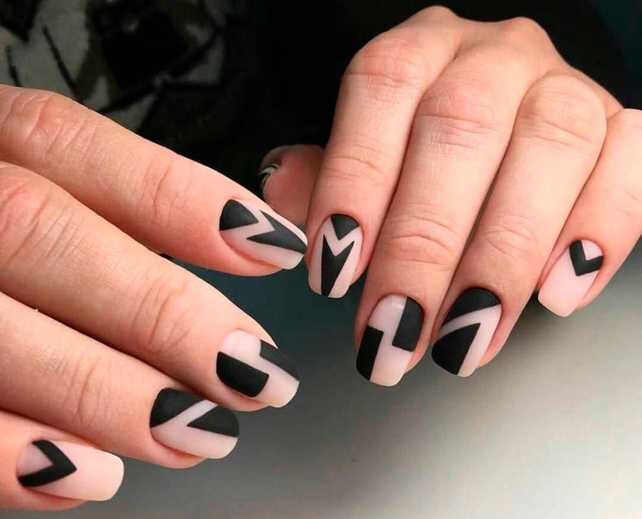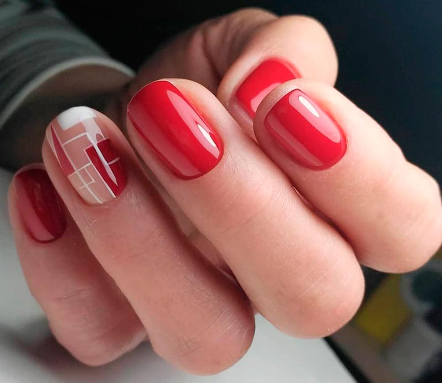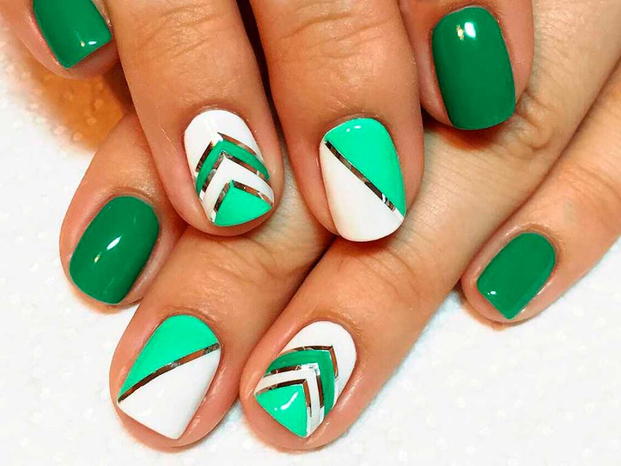 Les dessins géométriques sont l'une des tendances les plus en vogue en 2026. Elle a même éclipsé les célèbres gravures et dessins d'animaux sous forme de fleurs et de feuilles. De plus, il est très facile et simple de dessiner des rayures, des carreaux, des pois ou d'autres formes géométriques, même sur des ongles courts. Des rubans de manucure spéciaux en aluminium brillant sont également utilisés comme lignes.