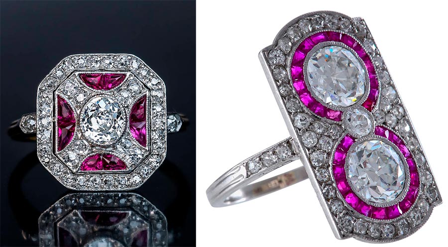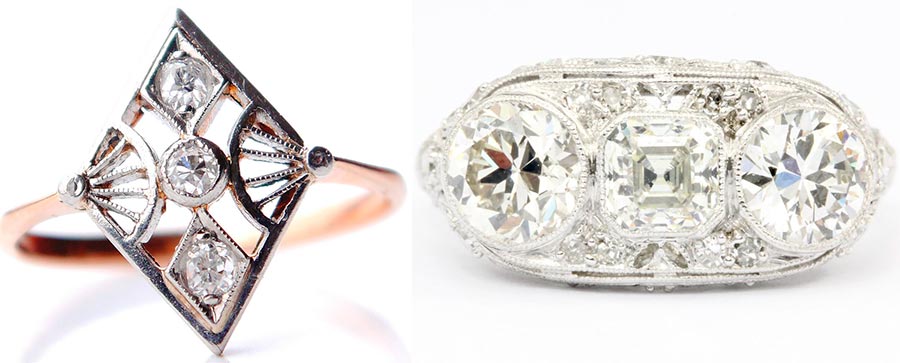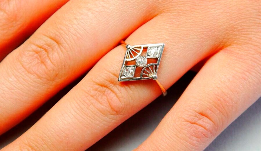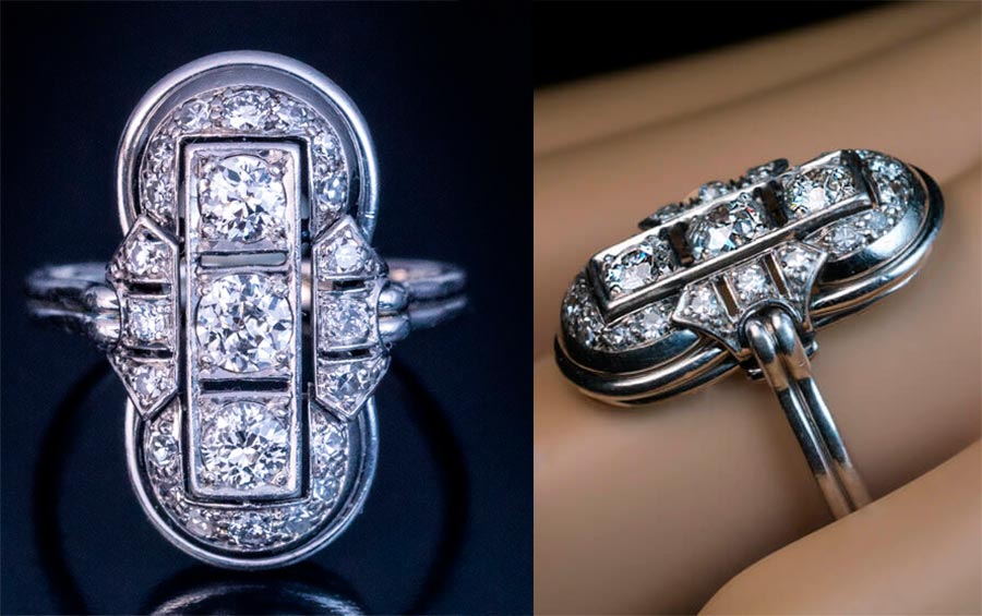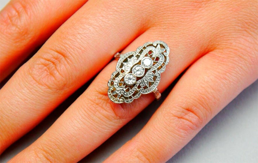 Les bijoux en platine ont toujours été moins courants et ont souvent un design minimaliste. Le plus souvent, le platine était utilisé comme métal compagnon avec l'or. Elle a servi de complément et a décoré les emplacements pour attacher des diamants ou des éléments individuels du produit. Une bague ou une chaîne entièrement en platine ressemble à de l'argent ou de l'acier en général, tandis que la fabrication du produit est beaucoup plus difficile et coûteuse.