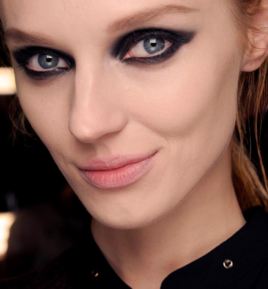 Les yeux charbonneux dans le style des années 90 sont assez simples à réaliser. À cette époque, les ombrages complexes et les transitions de couleurs n'étaient pas utilisés : un crayon noir ou des ombres noires étaient utilisées, et c'est tout. Mais aujourd'hui, vous pouvez jouer avec les nuances, en utilisant non seulement le noir, mais aussi le graphite. Les yeux ont été amenés presque «en cercle» du coin interne au coin externe pour les paupières supérieures et inférieures. La paupière mobile supérieure doit également être complètement ombrée avec des ombres noires ou sombres.