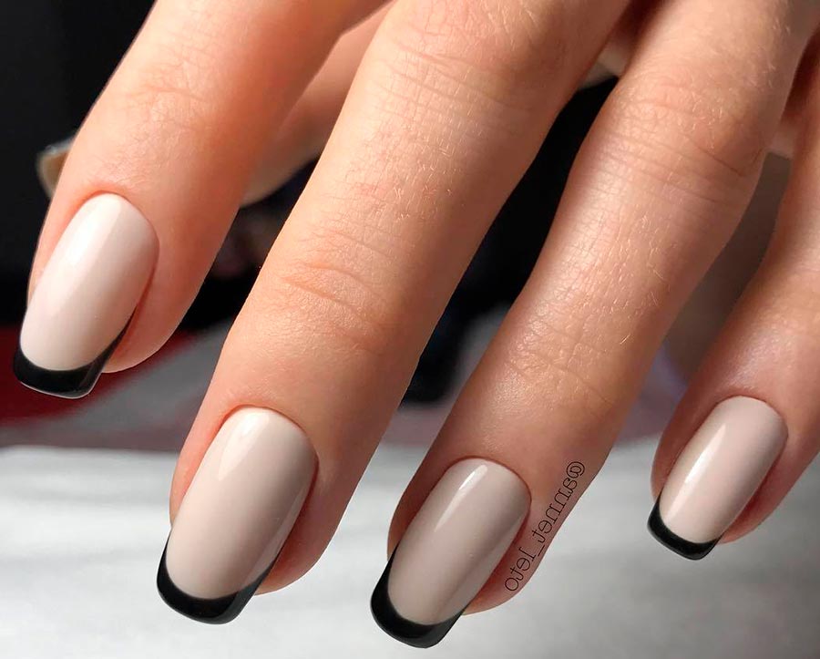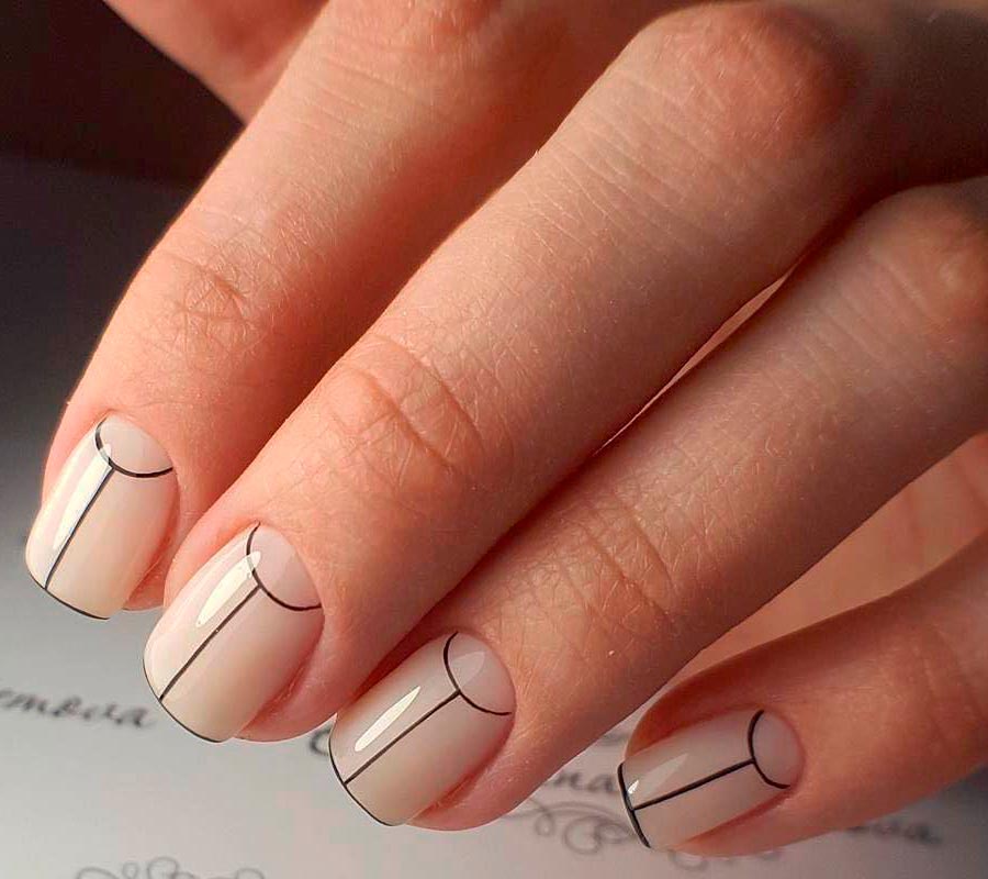 Les lignes et rayures noires claires, les carreaux, les ornements et les motifs auront fière allure sur le beige. Les lignes blanches se perdront un peu, mais vous pouvez utiliser de l'or ou de l'argent avec elles. Pour une manucure géométrique de couleur nude, vous pouvez également utiliser des rubans de manucure minces spéciaux de différentes couleurs (ou feuille), qui sont collés à l'ongle et recouverts d'une couche de finition.