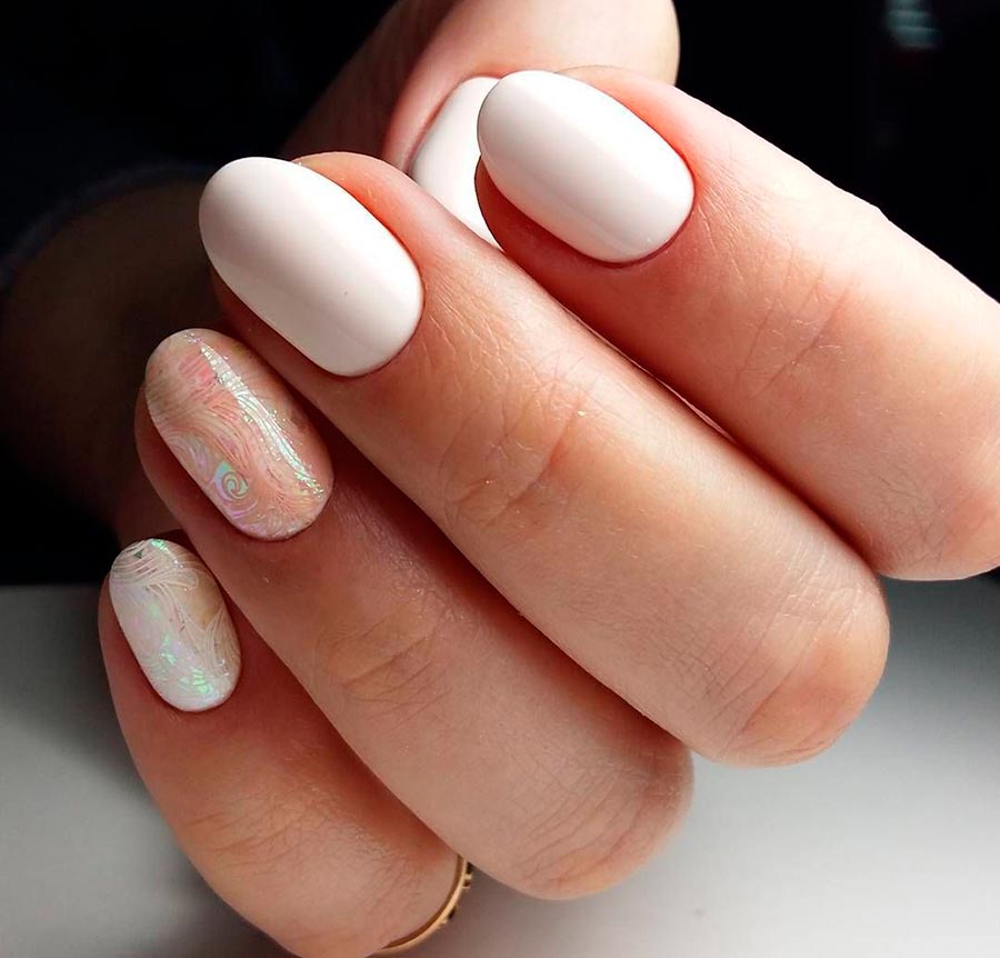 C'est le frottement de nacre transparente qui a l'air le plus impressionnant - il va avec n'importe quelle couleur claire. Le miroir recouvrira la teinte d'origine, il est donc recommandé de l'utiliser pour les teintes beiges et chocolat au lait plus foncées. Les gommages qui créent un effet 3D mat volumineux ou l'effet du sucre cristallisé conviennent mieux à la manucure automne-hiver qu'au printemps et à l'été.