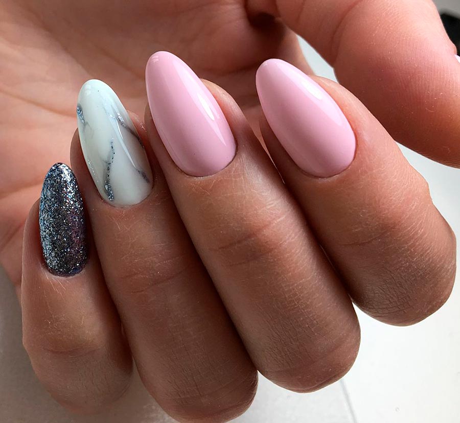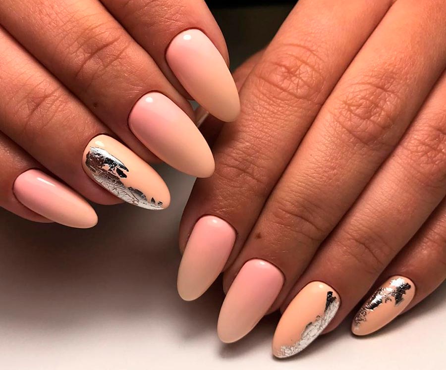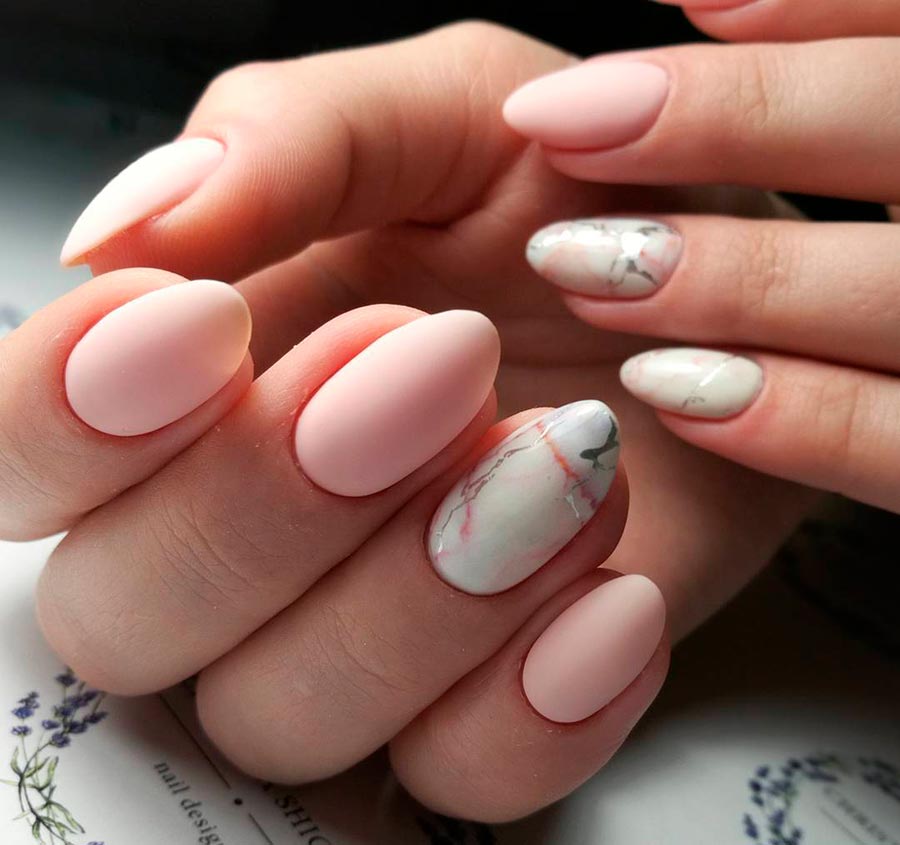 Il peut y avoir de nombreuses options pour la conception du marbre, mais il n'est pas si difficile de les compléter. Entrecoupées d'or ou d'argent, elles ont fière allure sur un motif marbré, des lignes fines et à peine perceptibles qui donnent de la brillance et attirent l'attention. "Marbre" peut être utilisé pour couvrir tous les ongles ou seulement un ou deux sur la main. Il est préférable de recouvrir le reste d'une couleur nude appropriée, qui est dupliquée dans le motif en marbre.