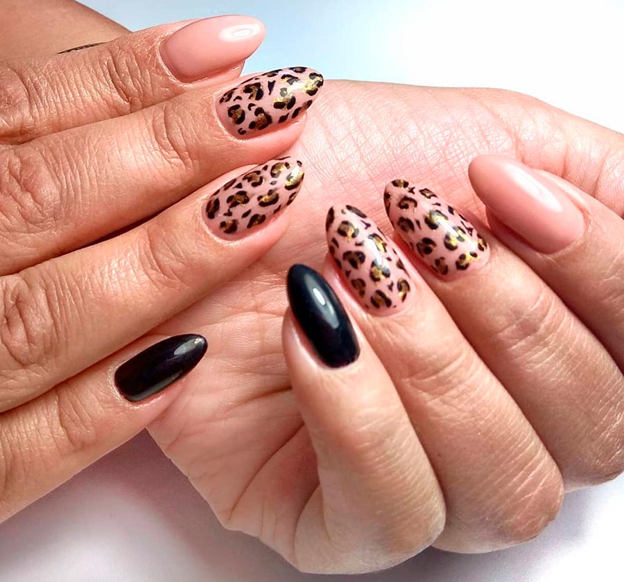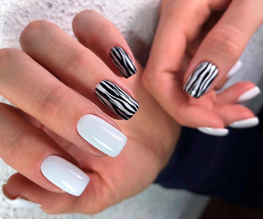 L'imprimé tigre comprend généralement une base orange caramel et des rayures chocolat noir ou noir. Choisissez une base nude foncée et appliquez la même couleur sur le reste de vos ongles. Le léopard combine une base plus jaune et des taches brunâtres avec des éclaboussures noires. Le zèbre est généralement dessiné sur une base blanche. Mais vous pouvez choisir n'importe quelle teinte nude pour la base, sans être lié aux couleurs naturelles des animaux, mais en utilisant uniquement un motif brillant.
