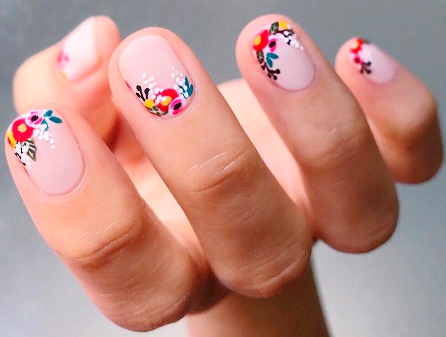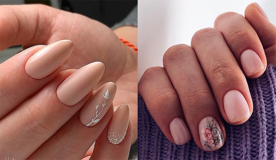 Si vous choisissez des couleurs rouges ou roses pour le dessin, appliquez un nude rosé comme base. Les fleurs bleues auront fière allure sur les nuances de blanc laiteux et de lavande. Choisissez une base beige pour les feuillages verts et la végétation tropicale, et une base caramel-café pour les teintes automnales. Les motifs de plantes et de fleurs peuvent être peints sur n'importe quelle base, en utilisant de l'or ou de l'argent pour le motif lui-même.