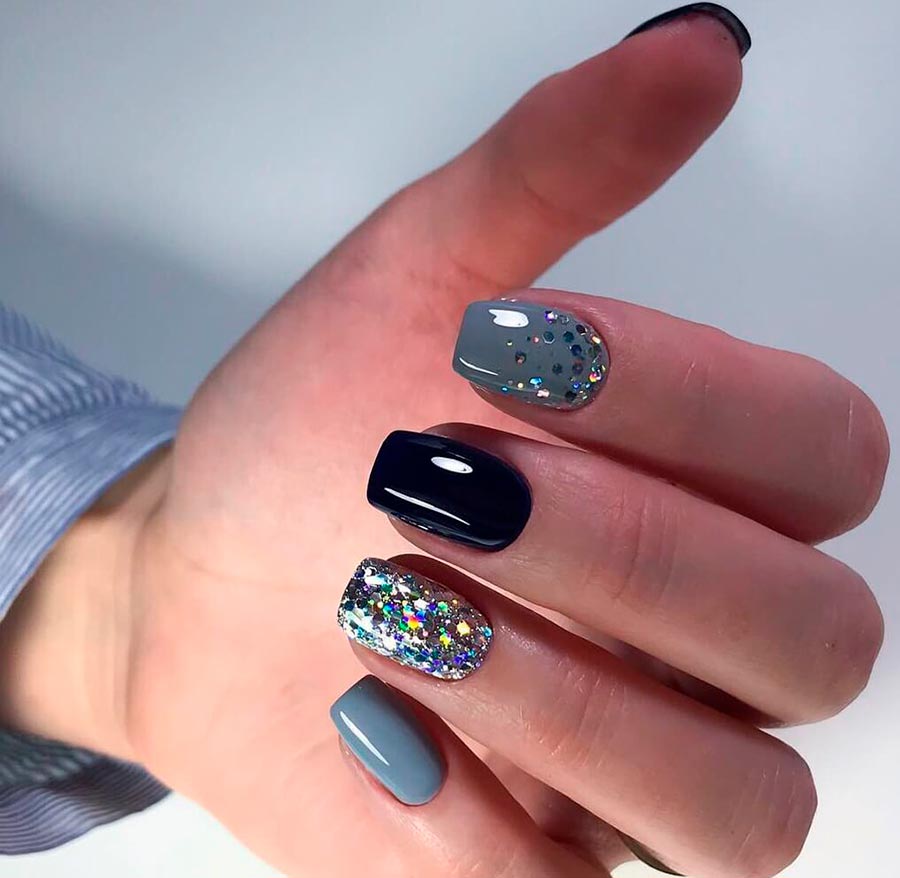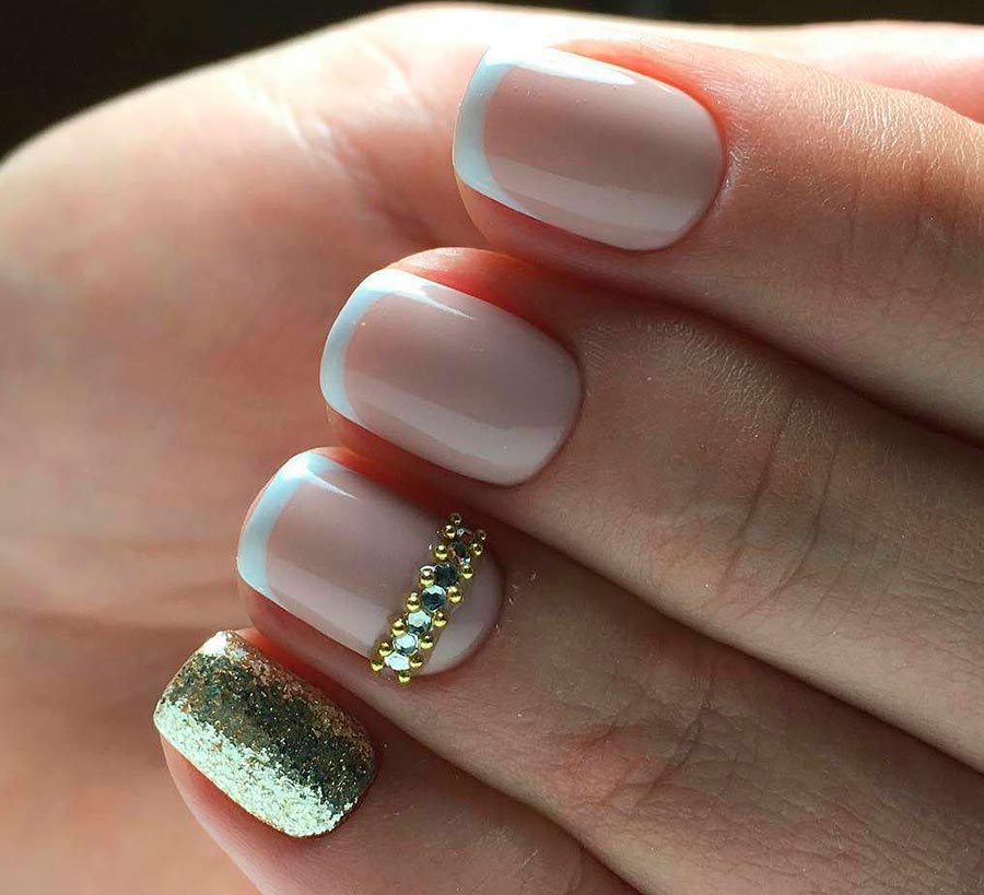 Si vous voulez plus de solennité et de fête, surtout s'il y a une raison à cela, vous pouvez utiliser en toute sécurité des paillettes et des paillettes sur les ongles courts. Si vous pensez qu'il ne sera pas possible de tracer un beau motif sur une plaque à ongles courte, recouvrez-la simplement entièrement de paillettes - elle aura l'air beaucoup plus sobre sur des ongles courts que sur des ongles longs.