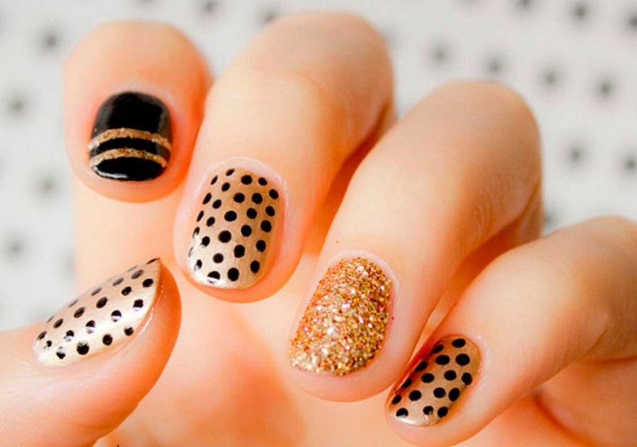 Et ce qui sera certainement facile à dessiner sur des ongles courts, ce sont des motifs géométriques. L'option la plus simple est les pois ou, comme on l'appelle aussi communément, pois... Les pois peuvent être appliqués sur l'ongle avec la pointe d'un pinceau fin ou avec une tige métallique spéciale pour manucure avec une boule au bout - afin qu'une goutte de vernis ne se répande pas.
