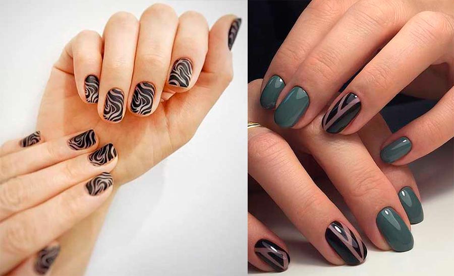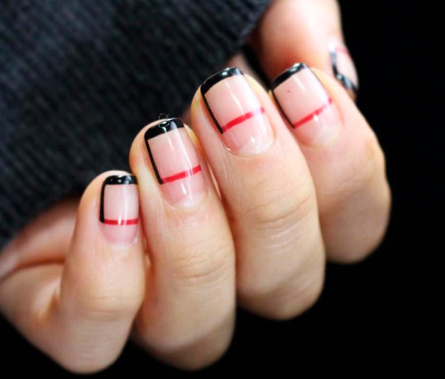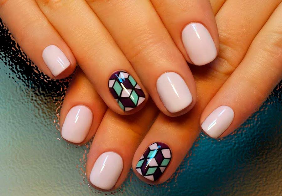 Diverses rayures le long et à travers l'ongle, la cage et les intersections, les dessins, les carrés, les triangles et les polygones auront également fière allure sur les ongles courts. Et il est extrêmement simple de les exécuter à l'aide d'un pinceau fin.