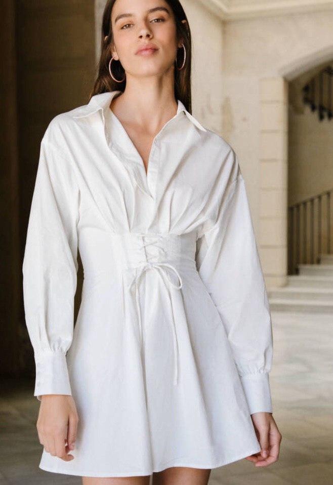 - Mini robes avec des éléments à la mode : imitation d'un corset, poches plaquées et manches volumineuses.