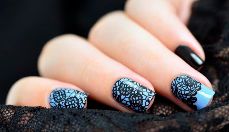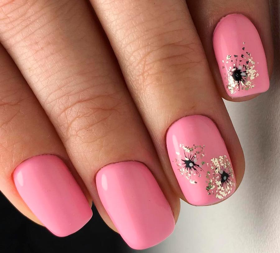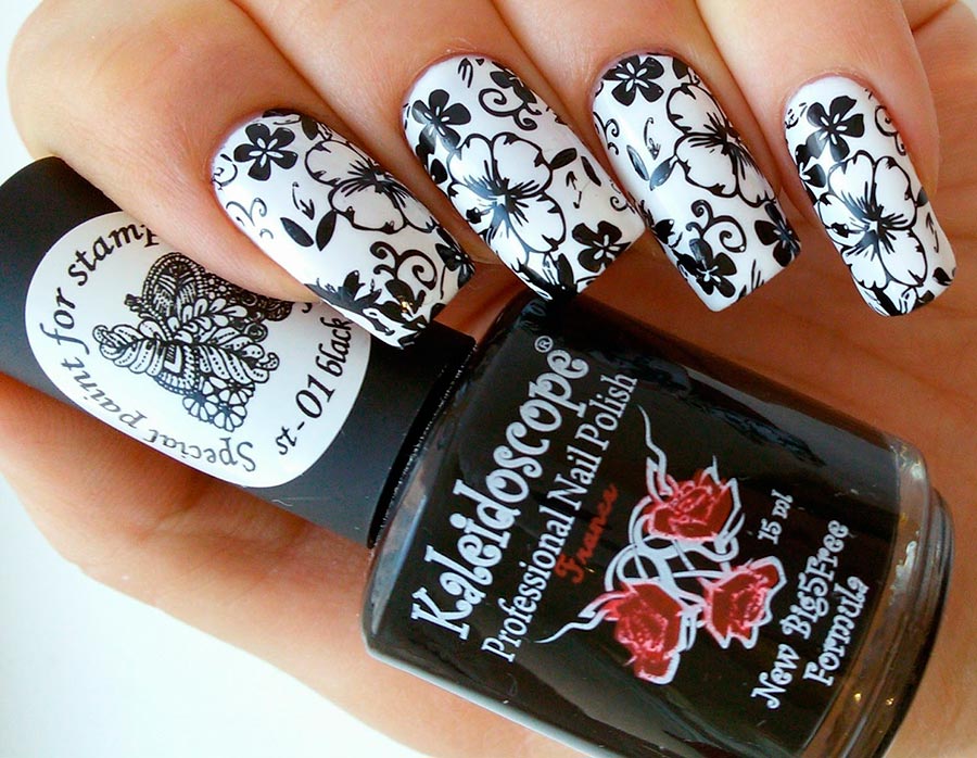 Une autre option pour une manucure aux fleurs "pour les paresseux" est l'estampage. Son principal avantage est la possibilité d'une exécution facile et simple même sur les ongles les plus courts. À la base, il s'agit d'un gaufrage sur les ongles, qui est appliqué avec un vernis contrastant sur une base monochrome à l'aide d'un tampon en caoutchouc spécial à motifs floraux.