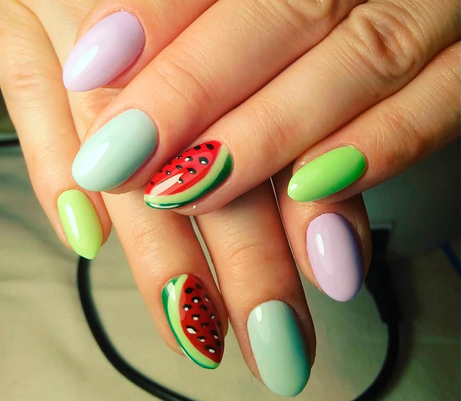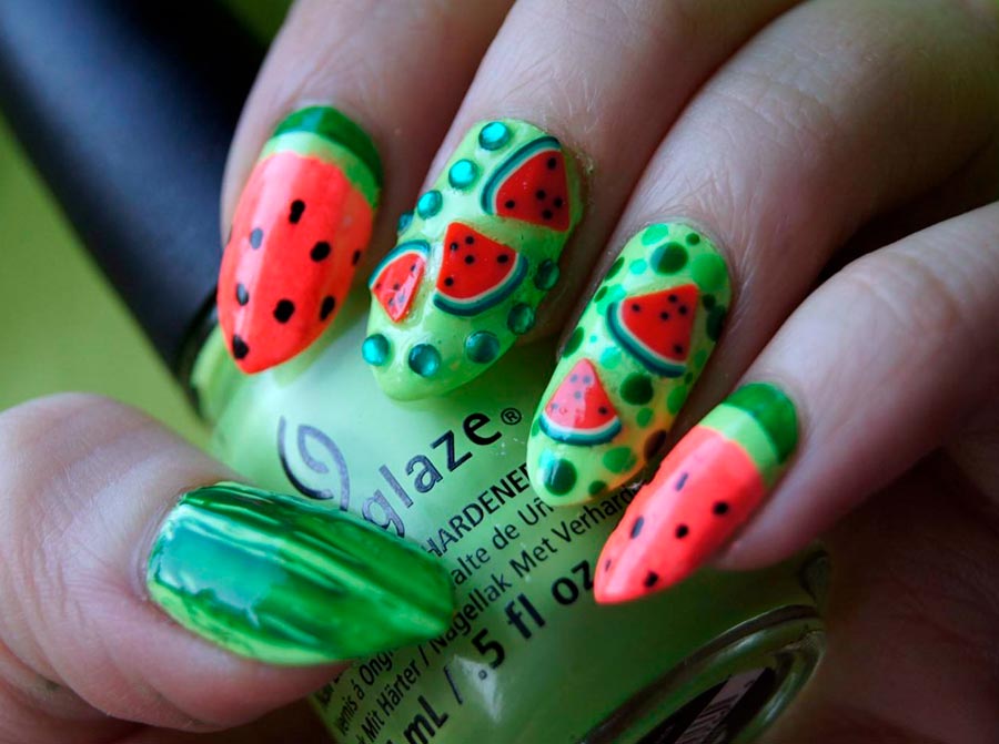 Un autre motif de pastèque, apprécié de presque tout le monde, bat des records du nombre de dessins d'ongles terminés en été. Il est très facile de le dessiner même vous-même à la maison. Une tranche triangulaire ou la moitié d'une pastèque ne nécessite que du vert, du rose et du noir.La croûte, la pulpe et les points noirs des graines, c'est tout ce sur quoi vous devez dépenser votre force et votre habileté. Mais la luminosité d'un tel design attirera immédiatement votre attention !