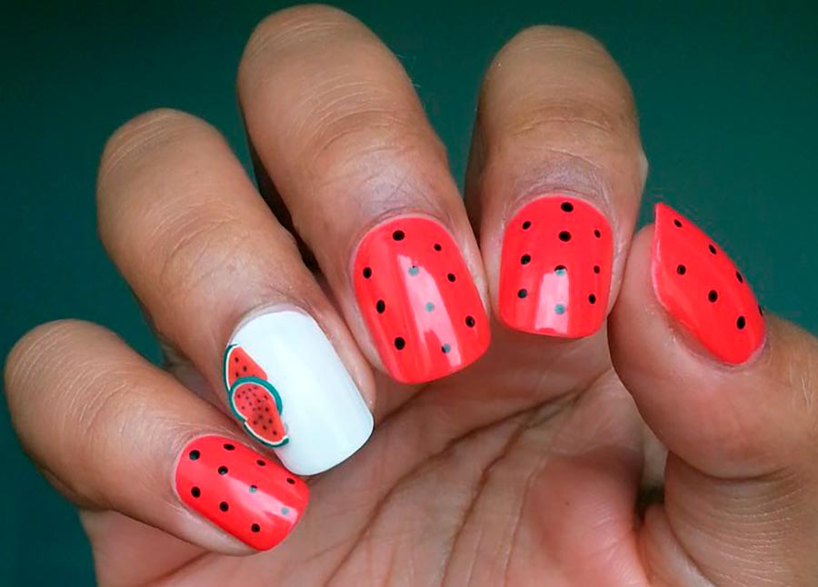 si vous dessinez une image sur un seul ongle, il n'est pas nécessaire d'utiliser du blanc pour les autres ongles: par exemple, une manucure "pastèque" sur un ongle est parfaitement combinée avec l'écarlate et le vert foncé sur les autres doigts;