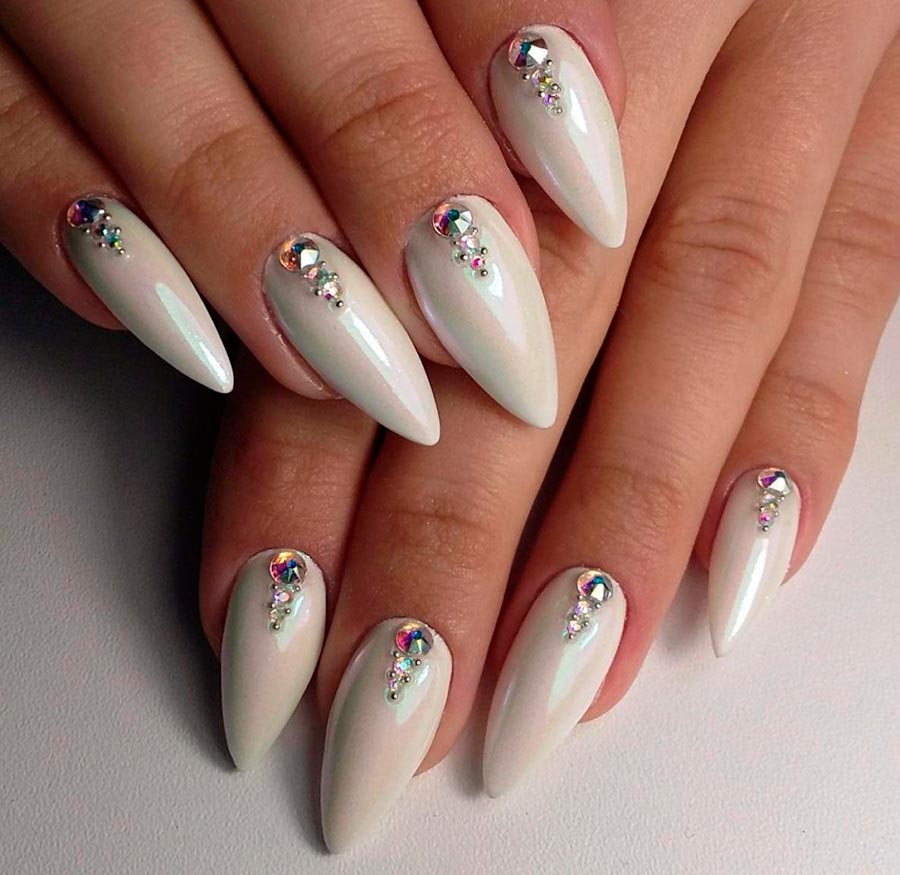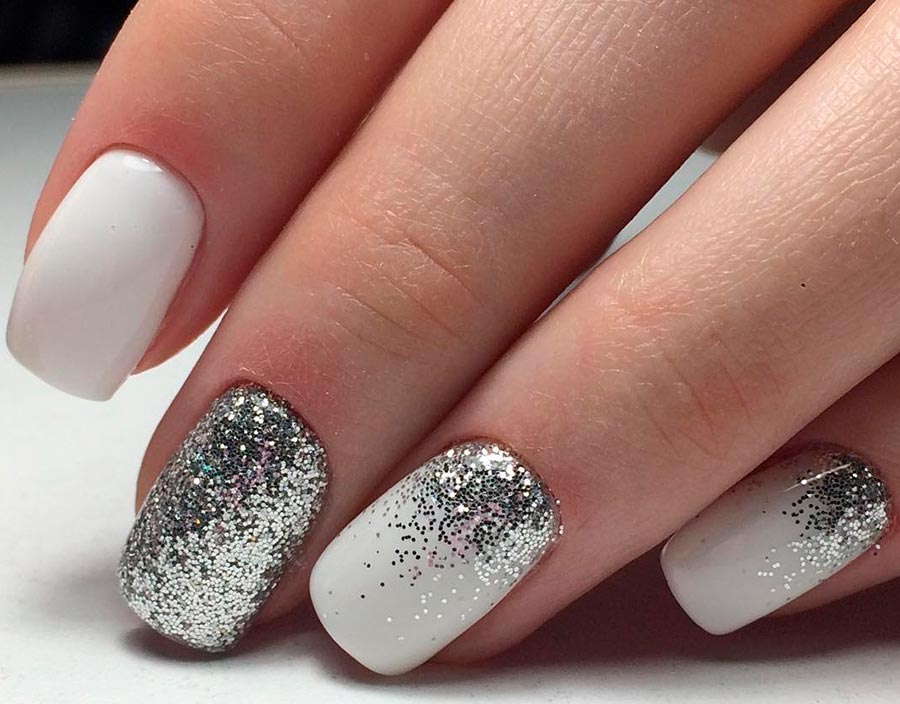 Le minimalisme laconique semble le plus réussi : un ou deux ongles sont recouverts de paillettes, et tout le reste est recouvert d'émail blanc. Mais vous pouvez également utiliser des paillettes individuelles ou des paillettes pour couvrir la base blanche. Plusieurs petites paillettes d'aluminium à la base de l'ongle sont magnifiques - ce décor peut être fait sur chaque doigt. Les strass de couleur blanche sont également bons, ils rendent la manucure plus "bijou". Mais il est préférable d'utiliser des strass de couleur pure et transparente plutôt que des arcs-en-ciel.