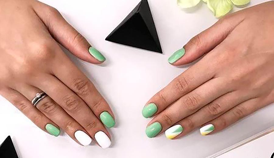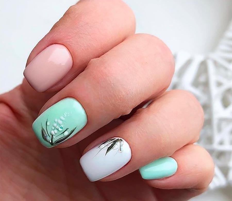 L'une des options les plus réussies pour une manucure printemps-été dans cette conception sera une combinaison de plusieurs nuances à la fois. Par exemple, le vert clair et le jaune pâle ont fière allure et du blanc émail leur est ajouté. Appliquez différentes nuances sur différents ongles, en alternant entre elles. Une telle manucure sera complète et complète, du fait que les couleurs pastel sont également très claires et, pour ainsi dire, "blanchies".