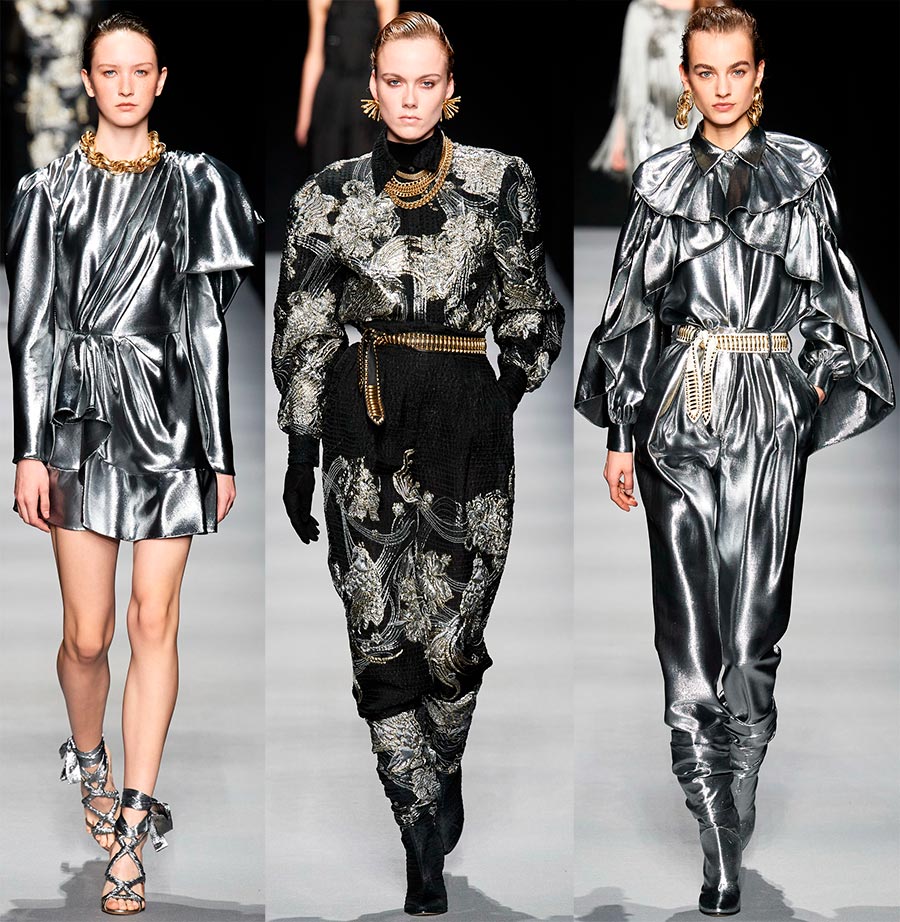 Dans la dernière partie de la collection, des images plus romantiques et délicates sont apparues - chemisiers, robes à volants et franges, volants, strass en forme de pluie, draperies.La palette de couleurs était dominée par des nuances noires et métalliques en argent. Le mannequin Bella Hadid a terminé le spectacle dans une robe luxueuse à volants en tissu noir transparent.