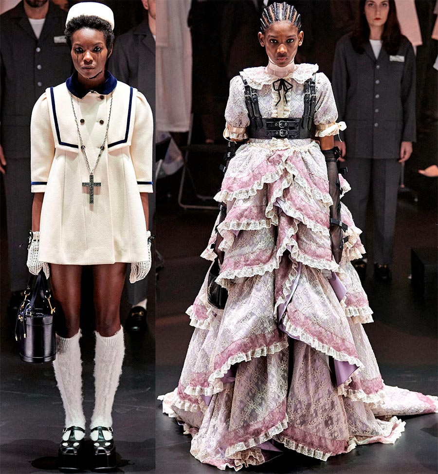 De nombreux modèles exposés ressemblent à de belles poupées en porcelaine du palais impérial. Si vous avez vu les collections de poupées en porcelaine du XIXe siècle, vous conviendrez sûrement qu'elles sont à la fois mignonnes, luxueuses et modestes. Les chaussures Mary Jane donnent au look un look spécial poupée. Les tenues dans le style des nuisettes et des images gothiques sont très mignonnes, qui ne se démodent pas, mais se transforment simplement à chaque saison et se reconstruisent vers une nouvelle réalité.
