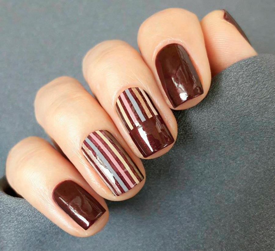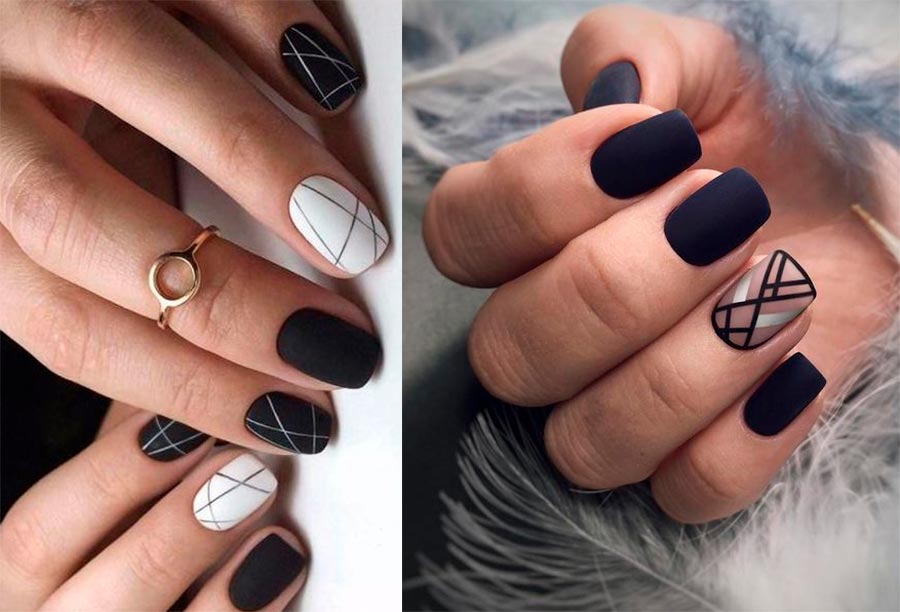 Eh bien, les rayures et les lignes sur les ongles ne doivent pas nécessairement être parallèles ou strictement perpendiculaires. Il peut également s'agir de lignes qui se coupent de manière chaotique et à des angles différents. Une telle manucure a l'air très élégante, surtout si vous utilisez des tons pastel clairs et nude comme arrière-plan, et pour les lignes - une couleur noire riche et classique.