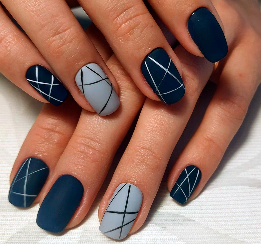 Cependant, la couleur de la plaque à ongles peut être sombre, alors pour les lignes et les rayures, il est préférable de choisir des tons clairs, idéalement blanc ou argent/or. Il suffit de tracer des lignes qui se croisent sur un ou deux doigts de la main et de laisser le reste sans motif, uniquement avec un revêtement de fond. Une telle manucure a l'air très sobre et minimaliste, et conviendra même à un look de bureau strict.