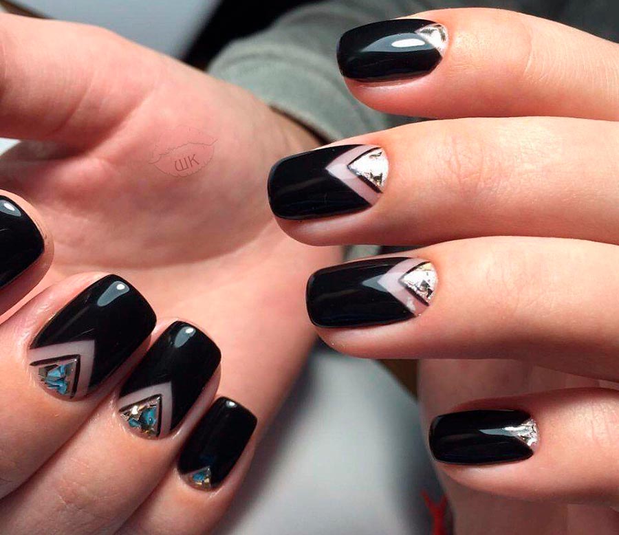 Le triangle a fière allure comme alternative à la manucure traditionnelle "lune" avec des trous pour les ongles non vernis. Mais maintenant, le trou doit être laissé non pas dans la forme arrondie classique, mais pour dessiner un triangle net. Des autocollants et des bandes spéciaux peuvent venir à la rescousse, avec lesquels vous pouvez créer le contour parfait.