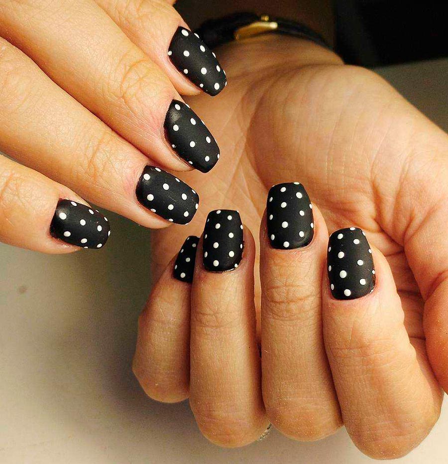 Dans le salon, les manucures utilisent un outil spécial en métal avec une pointe ronde à ces fins. Avec son aide, les pointes sont parfaites et peuvent être réalisées en différentes tailles. Les points ont fière allure dans les tons classiques. Par exemple, sur un fond blanc, vous pouvez mettre des points rouges ou noirs, sur un fond noir, vous pouvez dessiner des pois blancs. Les points peuvent être réalisés avec des paillettes et de petits strass, en les plaçant à la même distance les uns des autres.