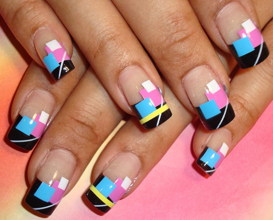 Les conceptions géométriques complexes ont tendance à combiner plusieurs nuances différentes plutôt que deux. Il comprend une abondance de lignes, de motifs, de courbes ondulées et pointues, etc. Vous pouvez utiliser des couleurs néon contrastées et compléter le motif avec de l'argent, de l'or, des paillettes d'autres nuances, des pierres et des strass.
