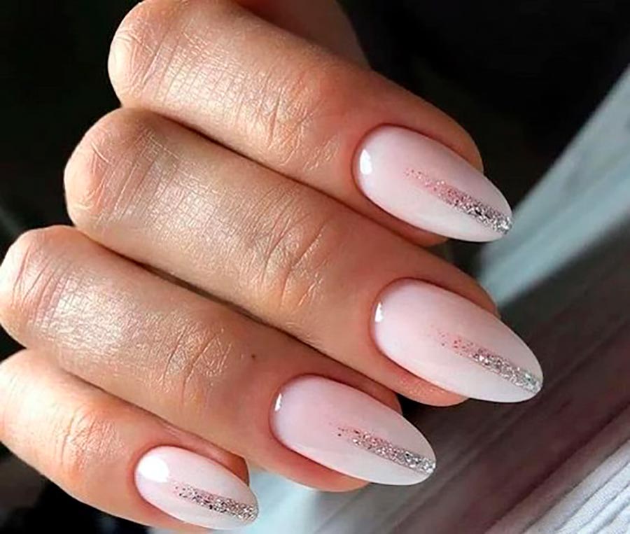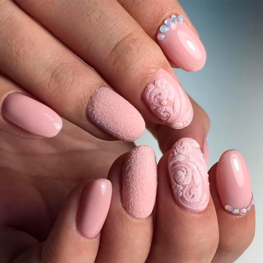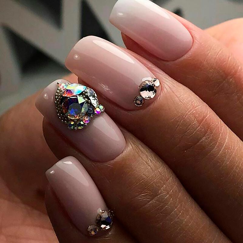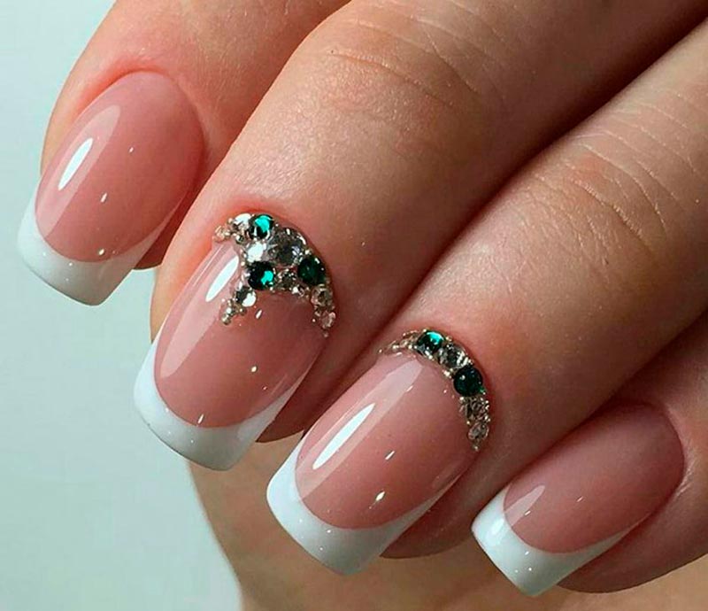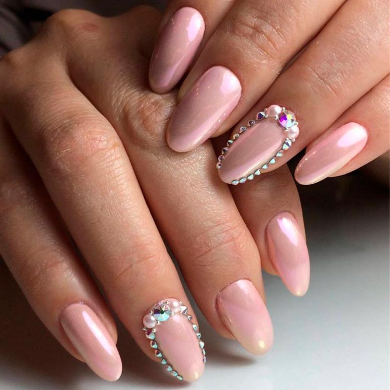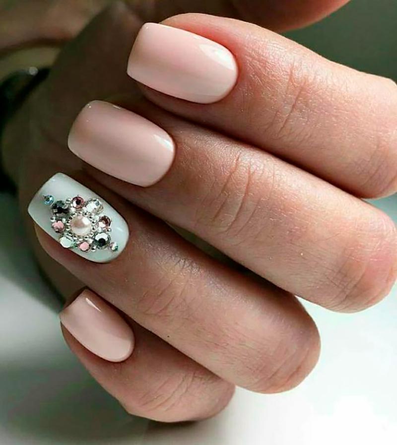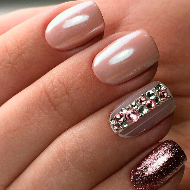 Les strass, les pierres et les paillettes sont un élément traditionnel de la manucure pour une occasion festive. Et ils peuvent être très pertinents juste au mariage. Pour les mariées audacieuses et lumineuses, vous pouvez choisir une manucure pétillante et irisée avec un design de strass et de paillettes sur chaque doigt. Si vous voulez plus de tendresse et de retenue, décorez un seul ongle de pierres. L'alliance se pose à l'annulaire, et c'est dans ce cas qu'il est recommandé de la décorer de paillettes.