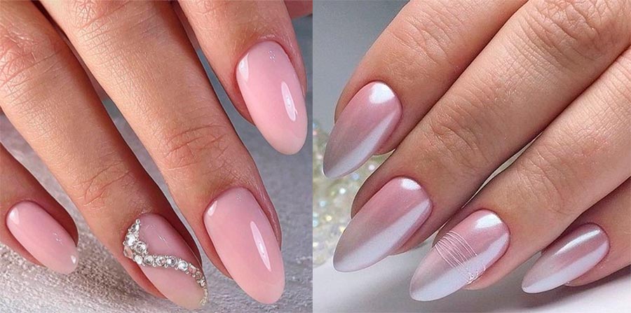 C'est particulièrement bien si la couleur du vernis à ongles en gel correspond à la teinte de la robe de mariée. Autrement dit, si la robe n'est pas blanche comme neige, mais crème avec une teinte dorée, choisissez des tons beige et caramel pour la manucure. Si la robe est rosâtre - rose, si argentée - lavande, etc. Les ongles recouverts de vernis gel léger émail doivent être créés dans une forme parfaite, quelle que soit leur longueur.