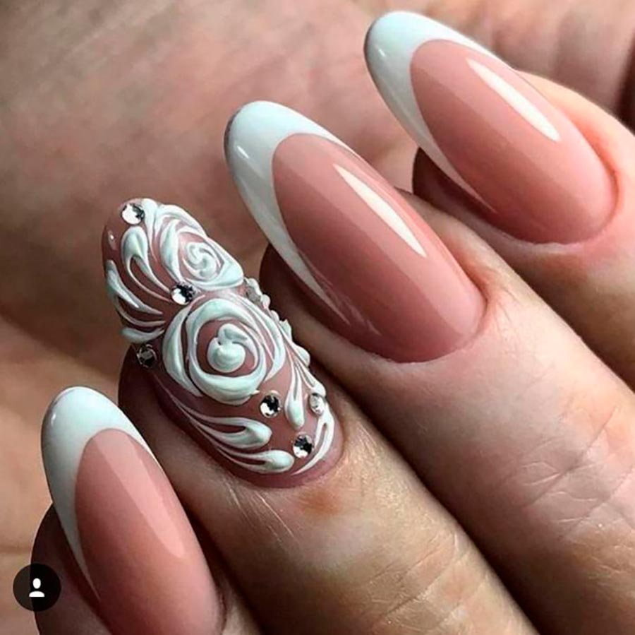 Lorsque les extensions d'ongles en acrylique et en gel étaient à la mode, beaucoup ont fait des dessins texturés volumétriques et modelés sur les ongles. Certains maîtres ont créé de véritables chefs-d'œuvre. Et en 2026, cette tendance est de retour, notamment pour la manucure de mariage. Aujourd'hui, il n'est pas nécessaire de réaliser des extensions d'ongles, le vernis gel est tout à fait acceptable. Et sur un ou plusieurs ongles, vous pouvez réaliser un beau dessin volumétrique en utilisant la technique 3D.