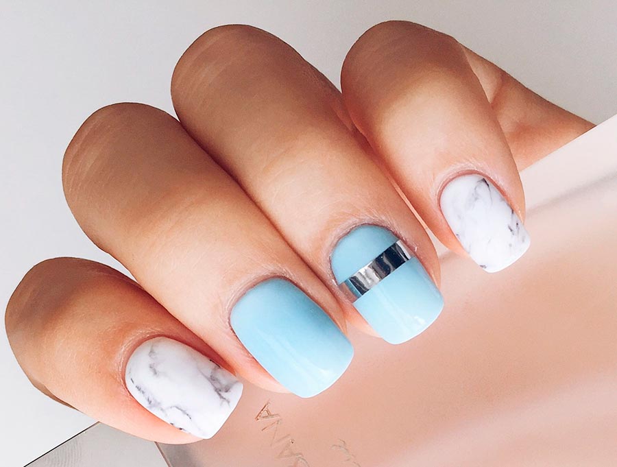 Enfin, nous voulons dire qu'une manucure de mariage ne doit pas nécessairement être blanche, nue ou légère. Aujourd'hui, sur les podiums des défilés de collections de mariage de designers célèbres, il y avait des modèles avec un maquillage éclatant et la même manucure éclatante. Pourquoi pas? On pense que la mariée devrait porter quelque chose de bleu. Dans notre cas, il peut s'agir en toute sécurité de soucis de couleur bleu clair ou avec un design bleu.