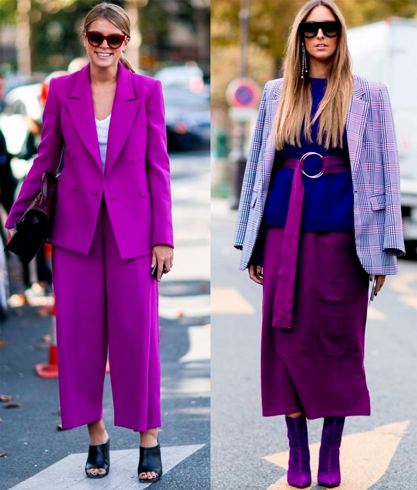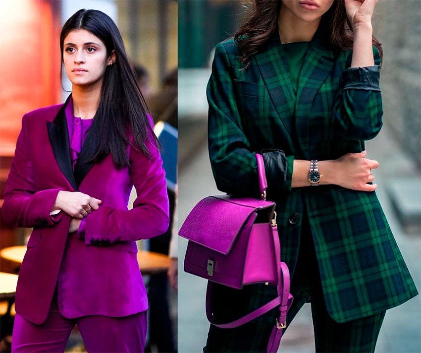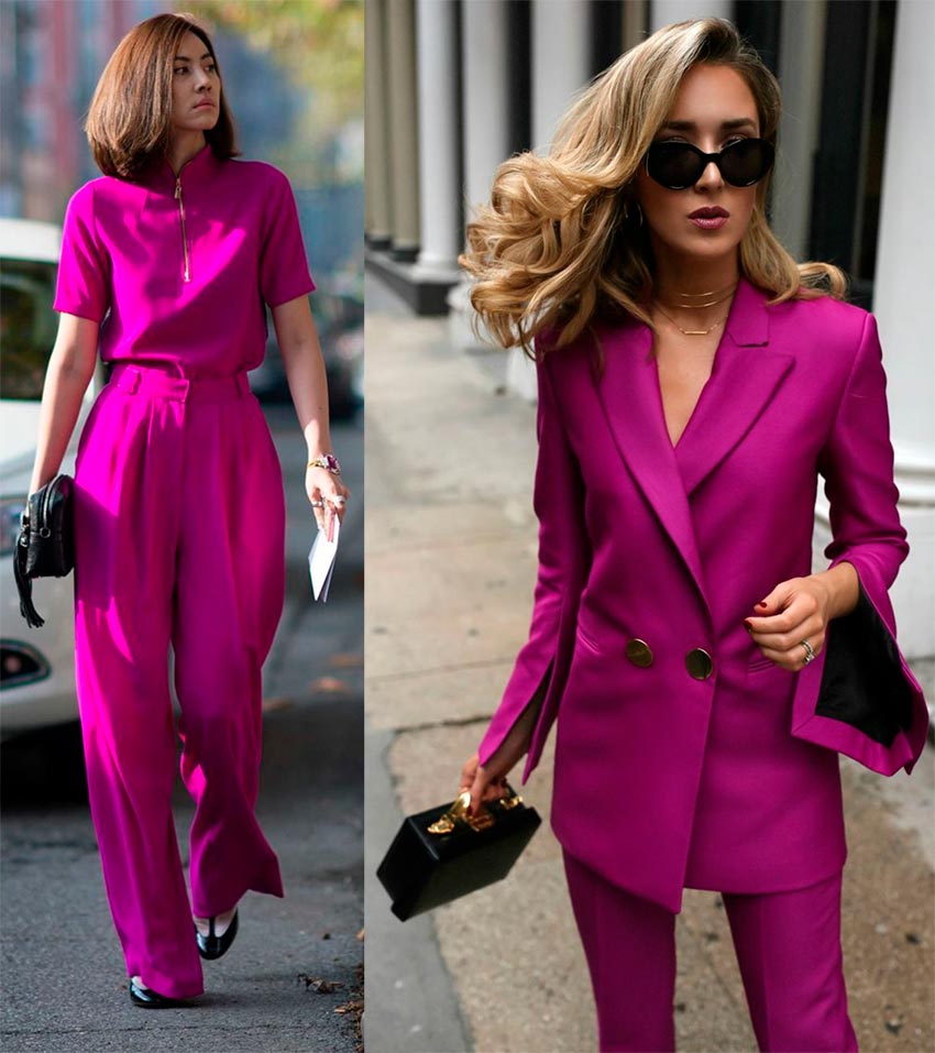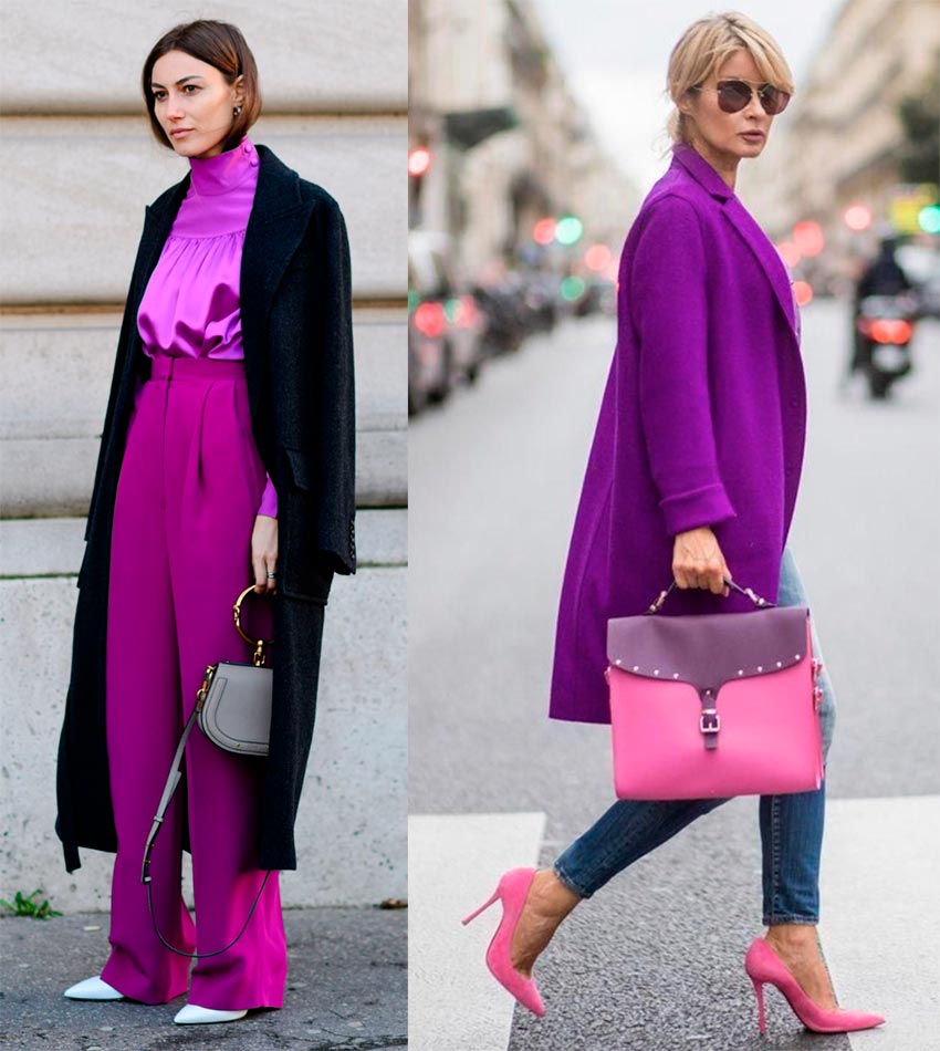 Un bon exemple de looks Magenta Purple serait une combinaison de nuances plus foncées et plus claires en un seul look. Une solution plus audacieuse et plus lumineuse - rouge et violet dans un seul ensemble.