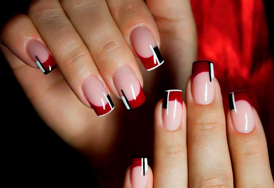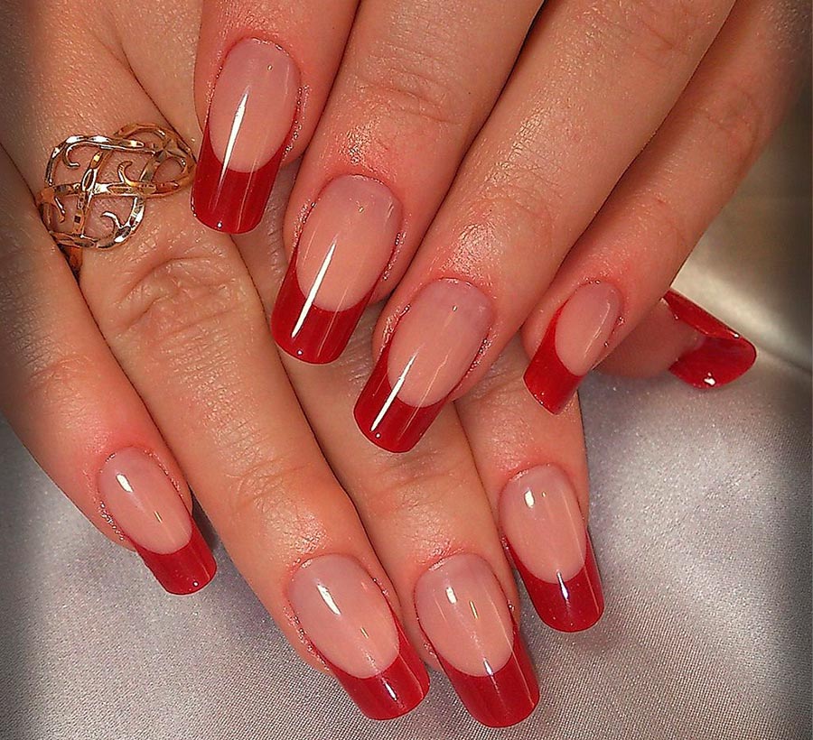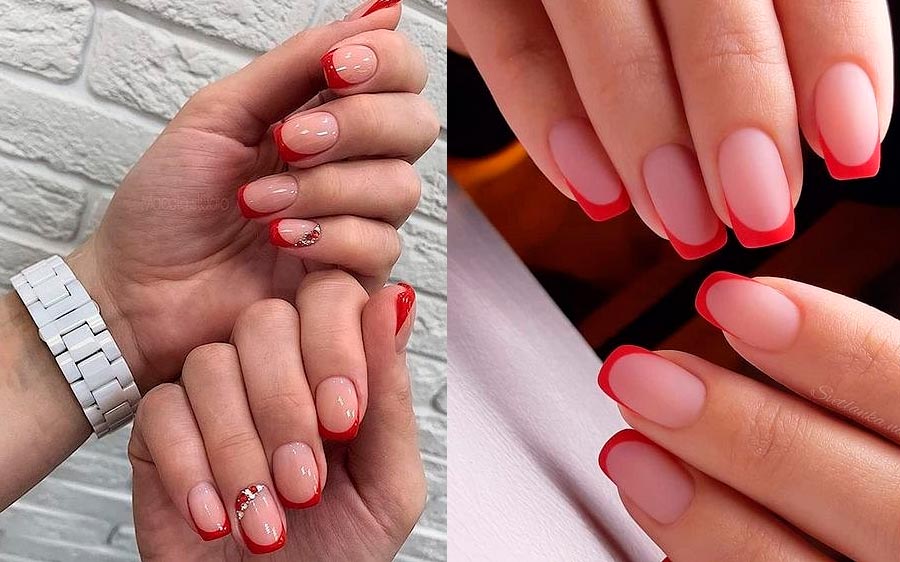 La veste rouge n'est en aucun cas une nouveauté, mais elle est toujours d'actualité aujourd'hui. Dans le même temps, il peut y avoir de nombreuses options pour une veste rouge. Il peut s'agir d'un "sourire" rouge sur une base transparente ou nue de la plaque à ongles. Cela peut être la base même de la plaque à ongles, et le sourire est fait dans une couleur différente. Le mélange de nuances rouges dans une conception de manucure française semble très intéressant. Autre option à la mode : une veste d'une seule couleur rouge utilisant un fond brillant et un sourire mat (ou vice versa).