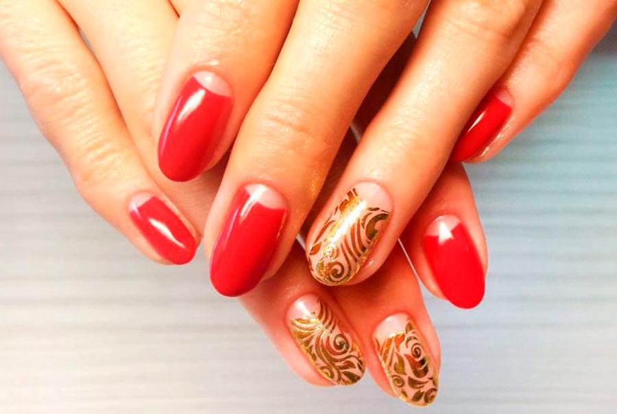Il peut y avoir de nombreuses options de conception pour une manucure rouge avec de l'or ou de l'argent. Le plus courant est d'appliquer la finition rouge classique sur la plupart des ongles, et de n'en souligner qu'un ou deux avec de l'or/argent. Vous pouvez dessiner des dessins sur fond rouge (géométrie, fleurs, points, etc.). Vous pouvez utiliser du vernis à paillettes pour créer une manucure française en combinaison avec du rouge.