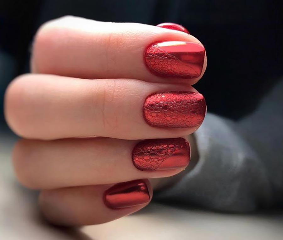 Une option plutôt audacieuse et lumineuse, mais elle peut être vraiment belle et noble. N'oubliez pas que vous devez choisir de l'or ou de l'argent dans la couleur de la manucure en fonction des bijoux que vous avez l'habitude de porter, notamment lorsqu'il s'agit de bagues et de bracelets. Si vous ne portez pas du tout de bijoux, commencez par le rouge de base : si c'est avec une nuance froide, préférez l'argent, si avec une couleur chaude, choisissez l'or.