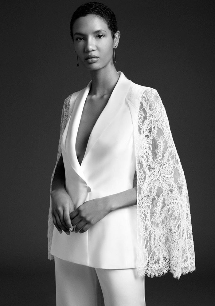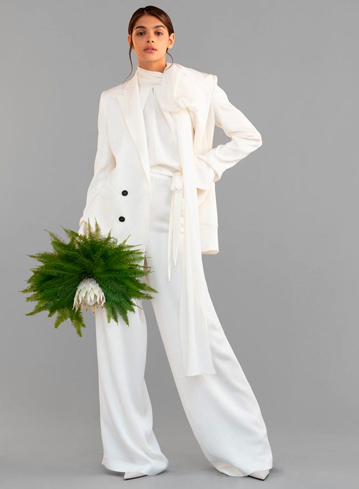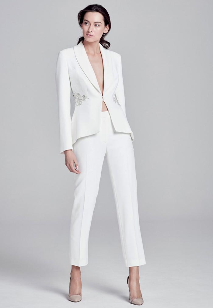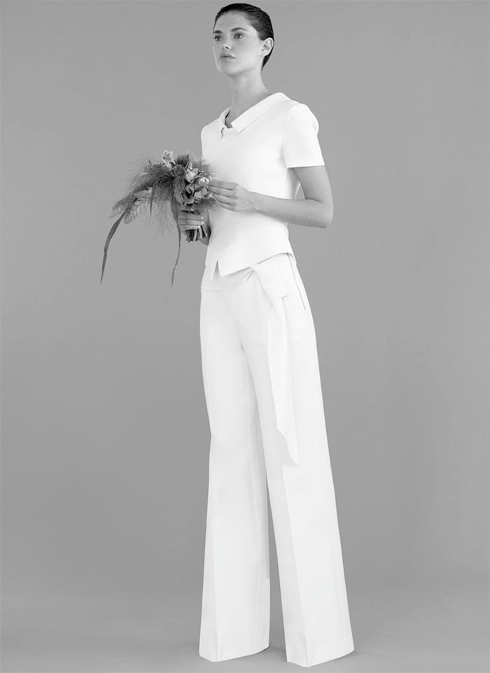 Ainsi, un tailleur-pantalon de couleur blanche ou laiteuse est transféré d'une garde-robe professionnelle à une garde-robe de mariage. De plus, sur l'image, d'autres options pour le bas peuvent être utilisées - une minijupe, un maxi ou même un short. Suzanne Neville, Cushnie et Ochs, Danielle Frankel, Roland Mouret - ont présenté dans leurs collections des options de robes de mariée dans un nouveau look inhabituel.