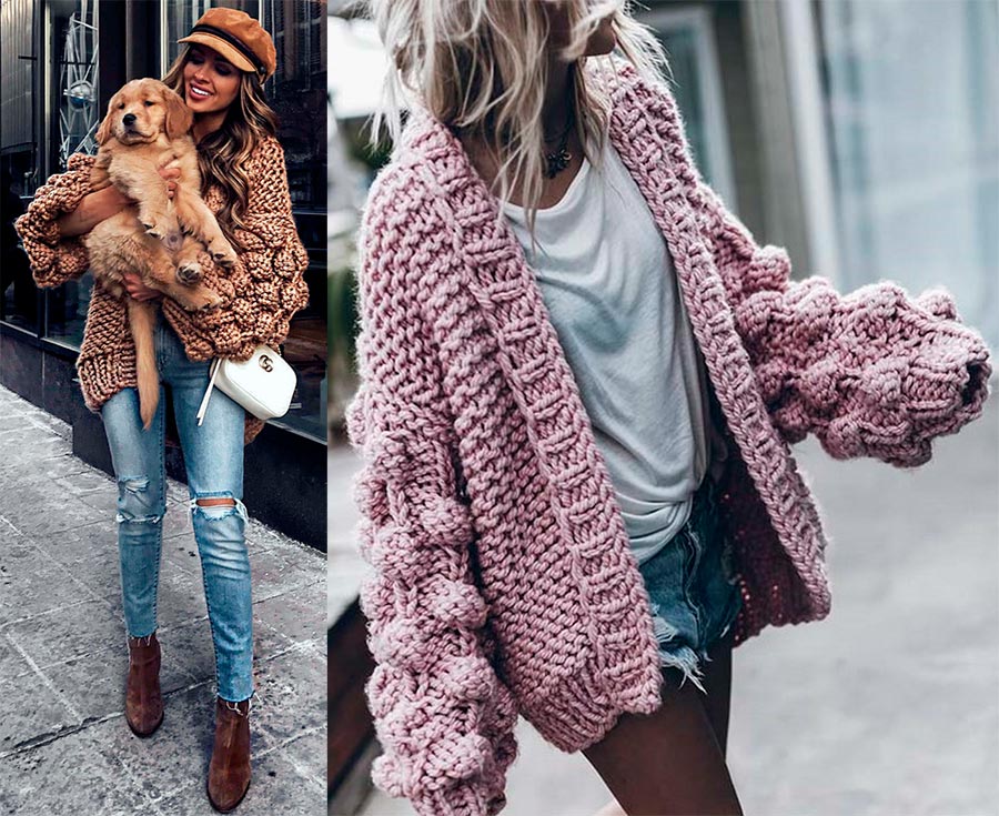 Les concepteurs ont également proposé des cardigans plus courts - juste en dessous de la cuisse. Mais dans ce cas, ils doivent être volumineux, de préférence en grosse maille, avec des volants ou des volants, ainsi qu'avec des manches "chauve-souris" ou des manches volumineuses avec des bouffées. Ces modèles seront confortables même par temps froid.
