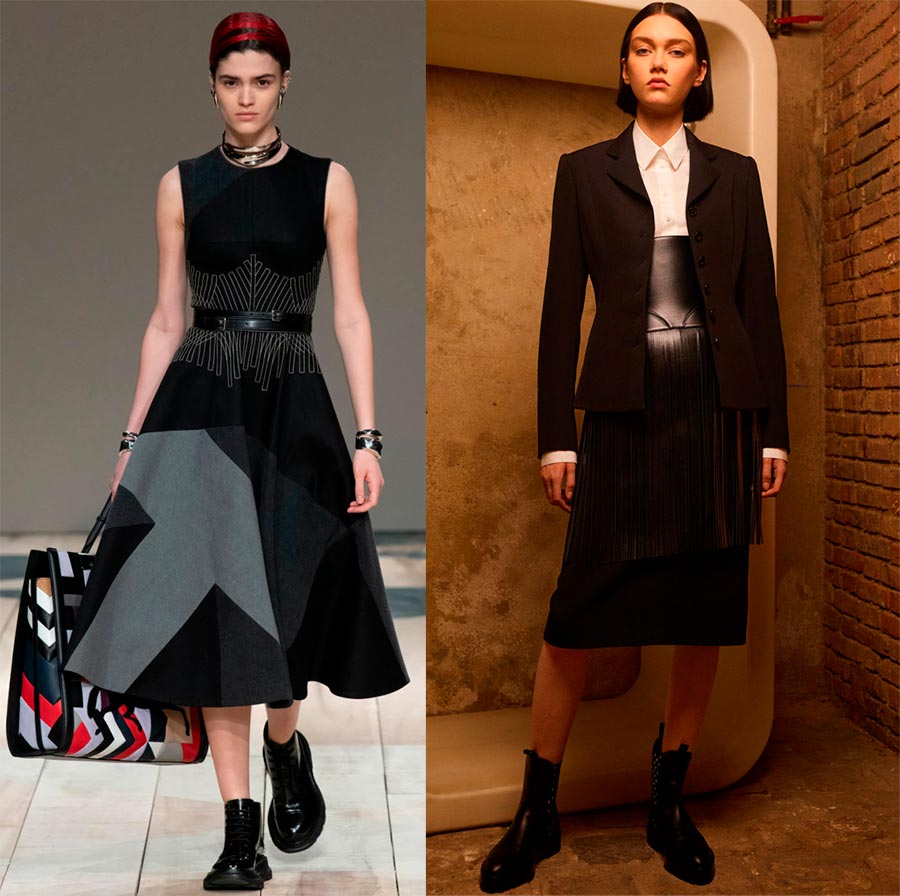 Les silhouettes ajustées féminines poursuivent leur marche triomphale sur les podiums et les collections. Les créateurs se concentrent à nouveau sur la silhouette féminine, mettant l'accent sur la taille et la poitrine de diverses manières :