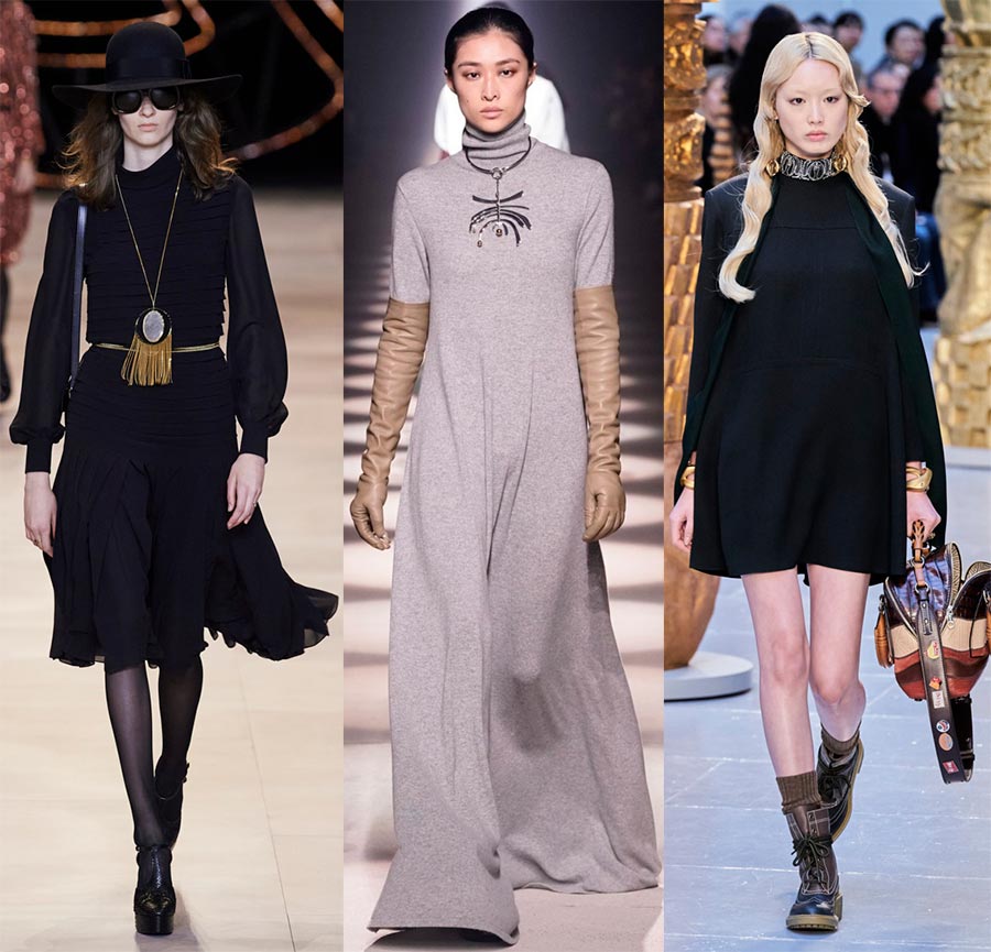 Les contraires s'attirent même dans la mode. A côté des silhouettes résolument féminines, les formes strictes sont à la mode. Dans presque toutes les collections, il y a une robe stricte de silhouette droite ou trapézoïdale, longue au sol et avec un col invisible, pour renforcer l'effet, elle est souvent aussi noire.