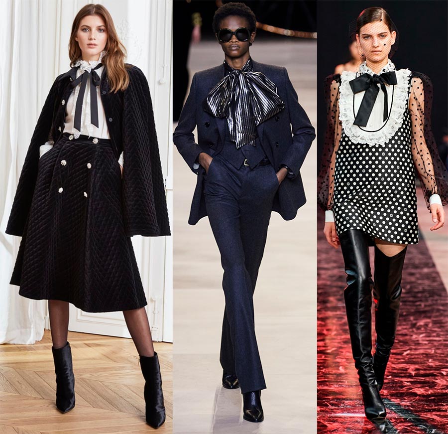 Alberta Ferretti, Ports 1961, Saint LaurentIl existe de nombreuses options pour les arcs. Le plus souvent, il y a des cols à nœud sur les chemisiers et les robes, des nœuds volumineux théâtraux ou des rubans noirs noués sous le col.