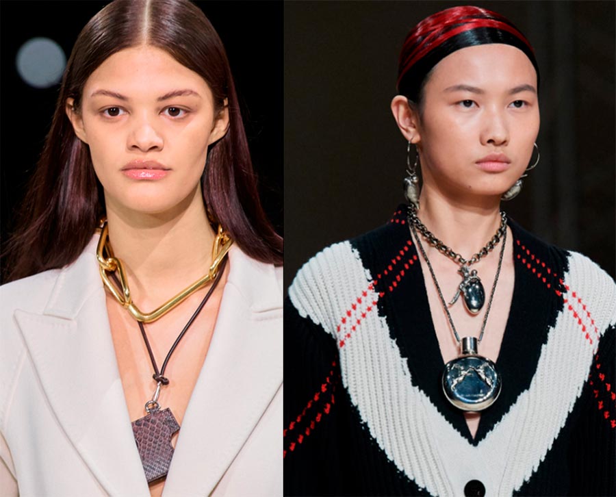 Les chaînes sont pertinentes, à la fois en métal et en plastique. Off-White présente de grandes chaînes de collier noires lors des salons, et les boucles d'oreilles à chaînes multicolores de la marque peuvent être incluses dans les tendances.
