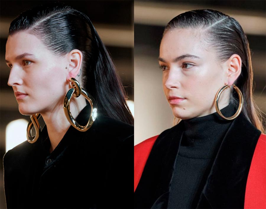 Si nous nous tournons vers la géométrie, les éléments ronds dans les bijoux sont à la mode. Ces boucles d'oreilles peuvent adoucir les traits acérés du visage. Les boucles d'oreilles asymétriques ne sont pas la première saison à la mode, mais cette saison, les boucles d'oreilles ne diffèrent pas par leur design, comme si une partie de l'une des boucles d'oreilles se détachait et qu'elle devenait plus courte. Boucles d'oreilles asymétriques des collections Dries Van Noten et Off-White.