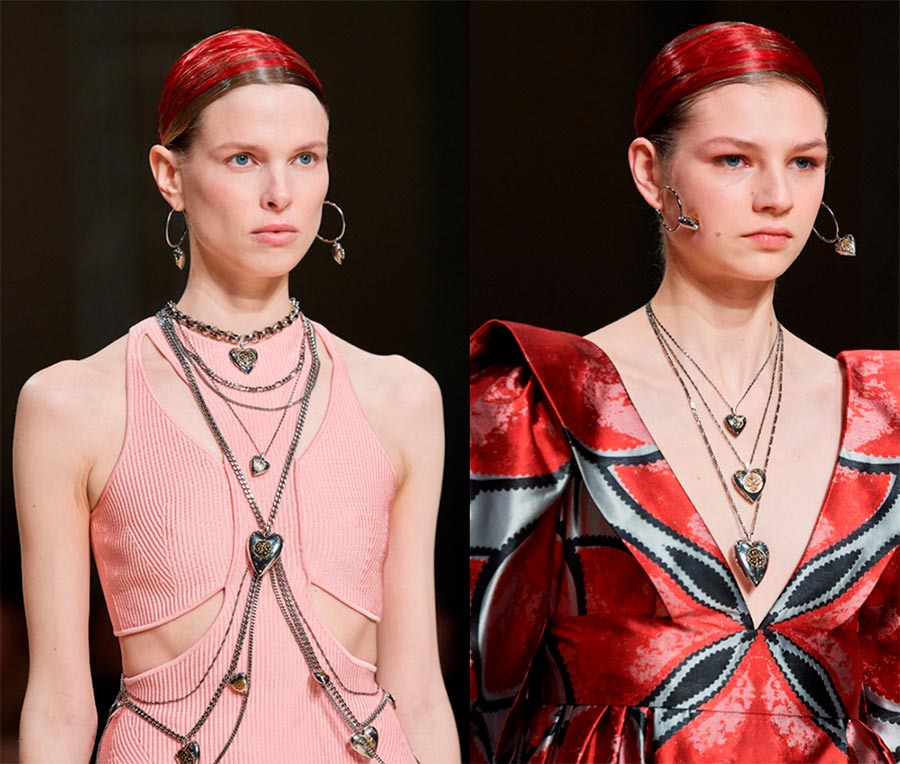 J'aime beaucoup l'idée d'Alexander McQueen d'utiliser des médaillons de cœur dodus sur des chaînes en bijouterie. Inutile de s'attarder sur un seul cœur, les créateurs de marques conseillent de se pendre avec des cœurs, comme des ponts avec des cadenas. Il y a un triste symbolisme dans une telle idée.