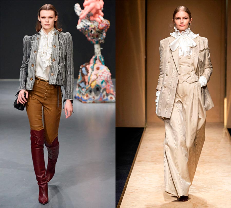 Un chemisier à volants convient à un code vestimentaire laxiste, afin de ne pas transformer l'image en une image romantique et raffinée, combinez un tel chemisier avec un costume formel, des chaussures rugueuses.