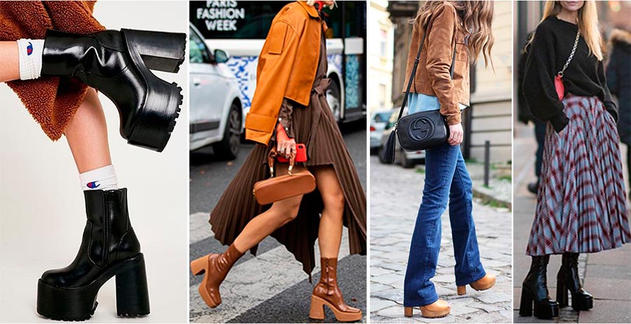 Que porter avec des bottes à talons et plateforme ?Avec des robes et des jupes, avec des jeans évasés. C'est très cool avec des chaussettes qui agissent comme un détail lumineux supplémentaire. L'essentiel est d'être prêt pour les regards et lors de la rédaction des ensembles, n'oubliez pas que les chaussures porteront l'ensemble de l'image un peu rétro.