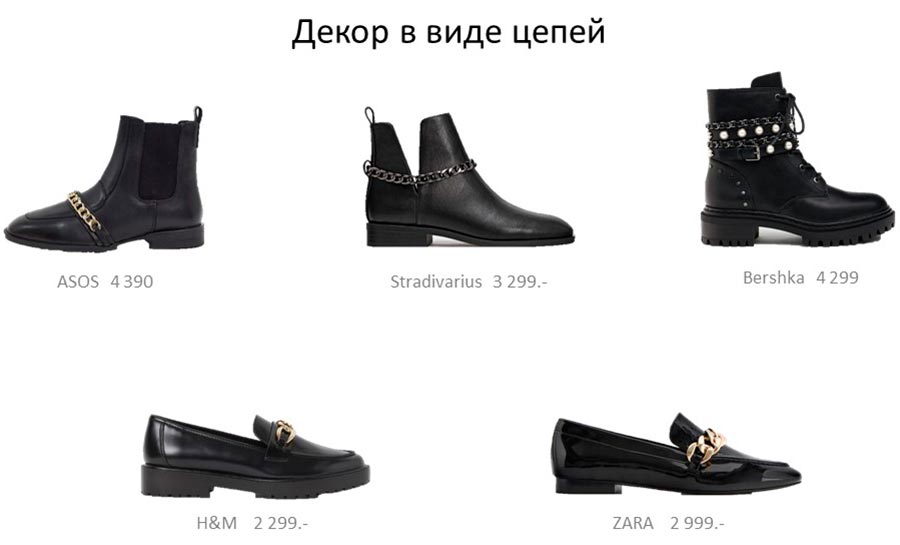 Cet élément inhabituel peut rafraîchir l'ensemble de l'image. Les concepteurs n'ont exprimé aucune règle spécifique, l'essentiel est qu'il y ait des chaînes. La chaîne peut être à la fois sur des chaussures basses, telles que des mocassins, et sur de gracieuses bottines à talons aiguilles, et sur des chaussures massives, la chaîne a un aspect particulièrement organique, renforçant leur brutalité.