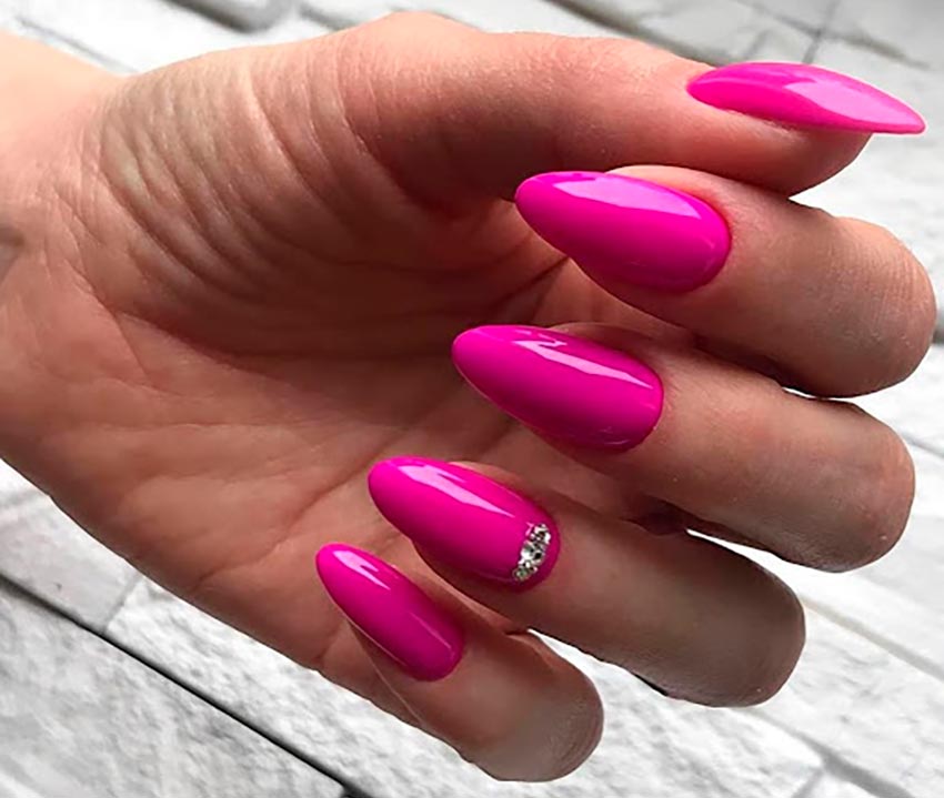 Une option, plutôt, pour les jeunes filles que pour les femmes mûres. Il est peu probable que le rose fluo fonctionne comme une couleur unie sur tous les ongles. Mais pour la conception, les dessins ou la combinaison avec d'autres nuances, ce sera une bonne technique. Et le rose fraise, donc "bonbon", peut convenir à différentes situations. Il est bon que certains accessoires ou vêtements portés sur vous soient combinés avec une telle nuance. En exécution indépendante, cette nuance, comme le néon, sera trop estivale, venteuse et insouciante.